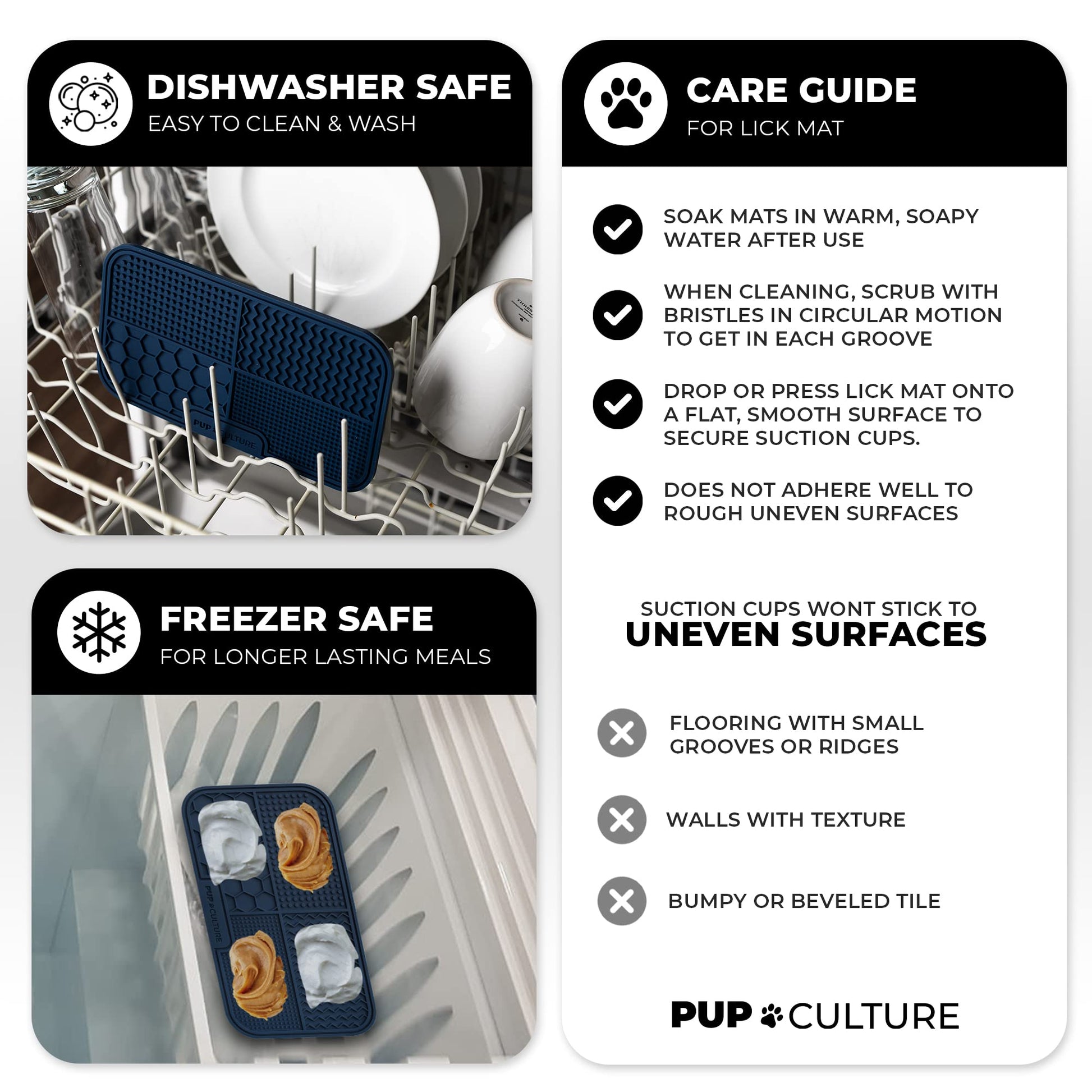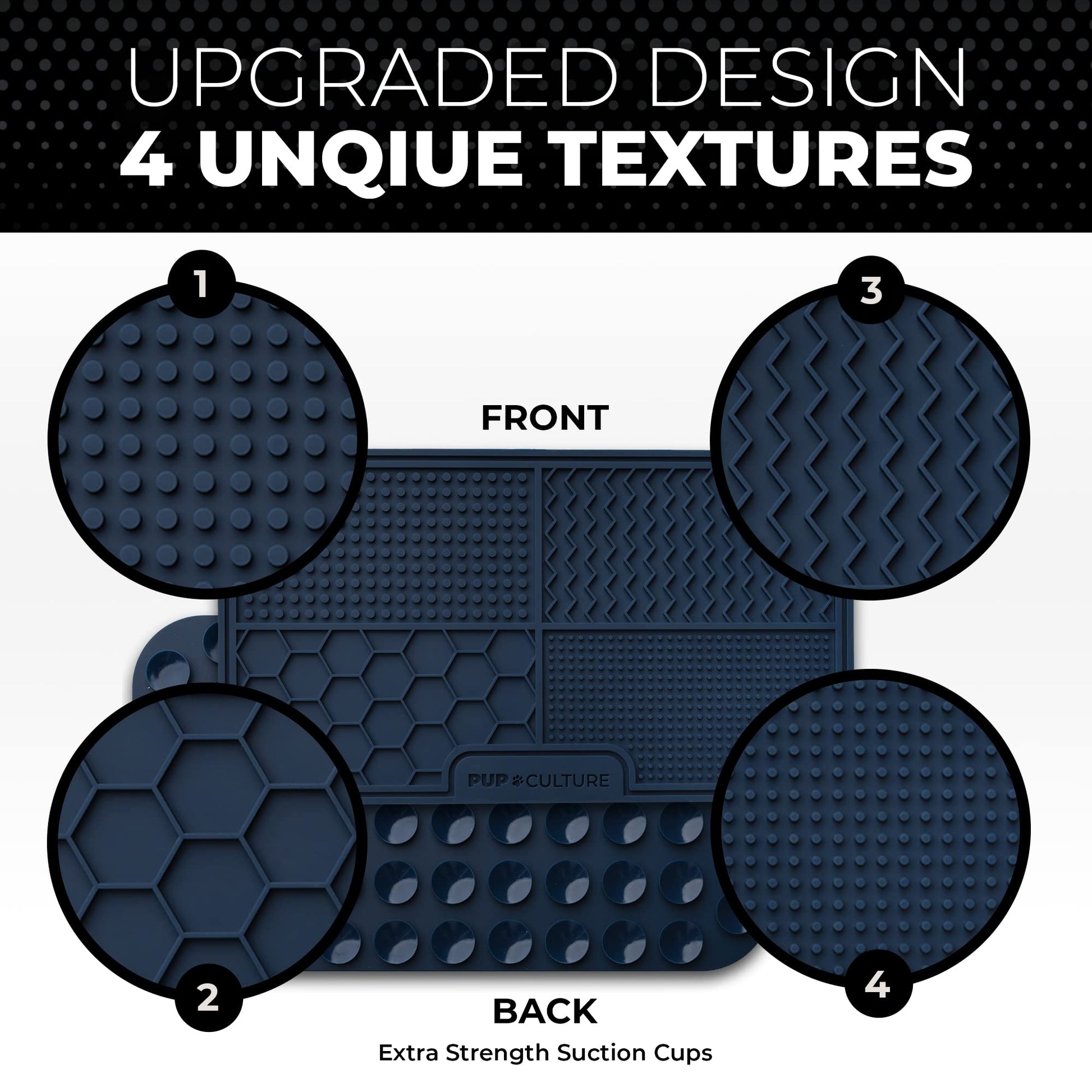 • SLOWS DOWN EATING HABITS. Does your pup eat every meal like it’s his last? Now you can stop your dog from biting off more than he can chew with Pup Culture’s Dog Licking Mat. Its unique, suctioning design outperforms the typical dog bowl with heavy-duty material that entertains your pup for hours on end, all while providing the nourishment he needs.