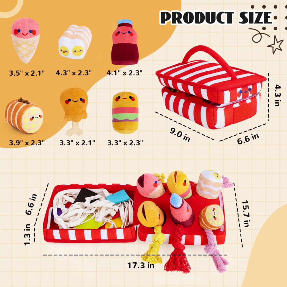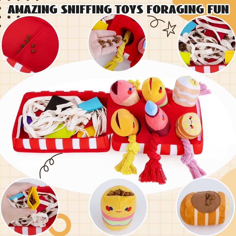 - 🐶【HIDE AND SEEK DOG ENRICHMENT TOYS】Noodles, dolls, small compartments, pockets, etc. can hide food, making the dog excited and focused on sniffing.The more difficult challenge is to put all the food in and cover the lid, so that the dog can complete the whole foraging process in turn.The dog eats while digging and playing hide and seek with the food, feeling super satisfied and happy.