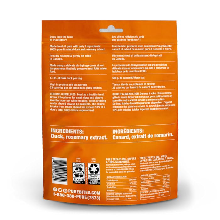- Dogs love the taste of PureBites! 100% natural, pure, high in protein, only 33 calories per duck tender, and nothing added like artificial colors, fillers, sweeteners, or glycerin