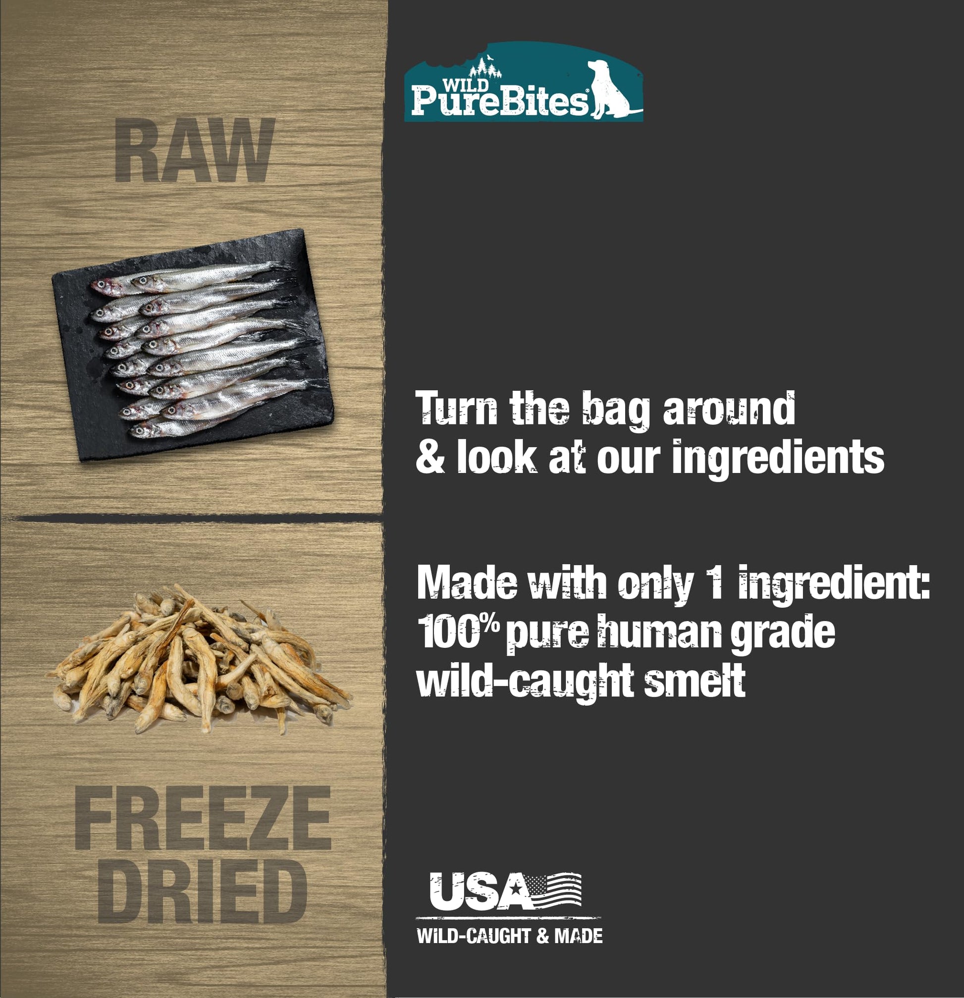 - Go ahead, look at our ingredients; made with only 1 simple, exotic human grade ingredient: 100% pure wild-caught smelt; proudly sourced and freeze dried RAW in the USA; a great high-value treat, topper, or training aid for your dog