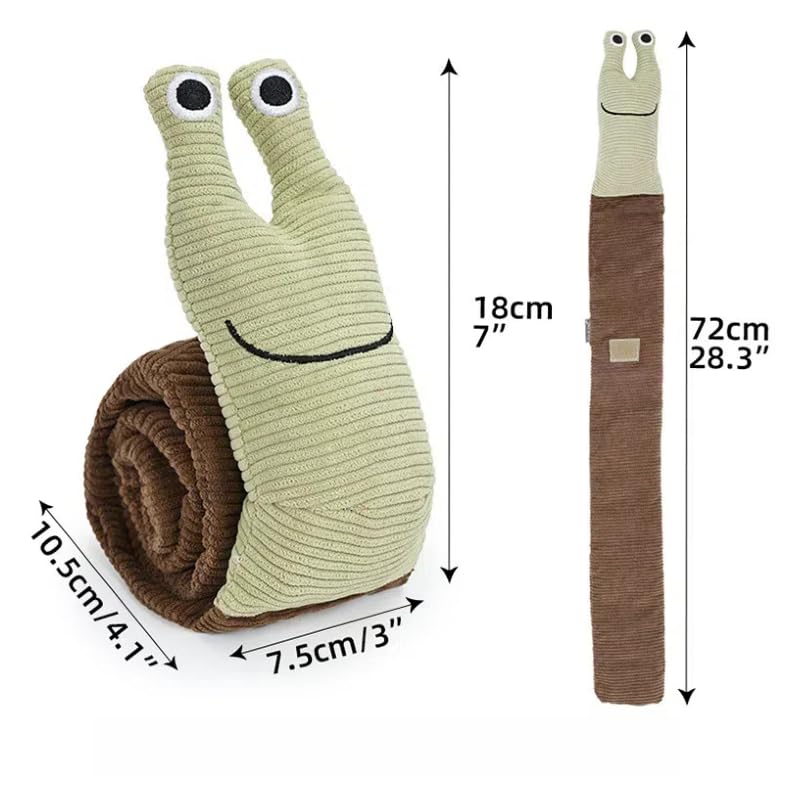 Details: "Looking for a fun and enriching toy to keep your dog entertained indoors? This adorable snail puzzle toy is designed specifically for small and medium-sized dogs who love to sniff, forage, and solve light puzzles. Made from soft corduroy plush with no hard parts or sharp edges, it's a safe and gentle toy perfect for non-aggressive chewers. Unroll the snail’s tail to reveal multiple hidden treat pockets—just tuck in your pup’s favorite kibble or small snacks, roll it up, and watch as they eagerly sniff and paw their way through. The built-in squeaker adds a layer of excitement, encouraging interactive and independent play. Ideal for apartment living or work-from-home environments, this toy offers 15 to 30 minutes of focused fun while reducing anxiety and boredom. Whether you're trying to keep your pup occupied during video calls or just looking for a cute and quiet alternative to noisy chew toys, this snail brings joy and stimulation in one compact package. Machine washable and reusable, it's also an eco-friendly option for daily play. A great gift idea for pet parents, dog birthdays, or new puppies joining the family!"