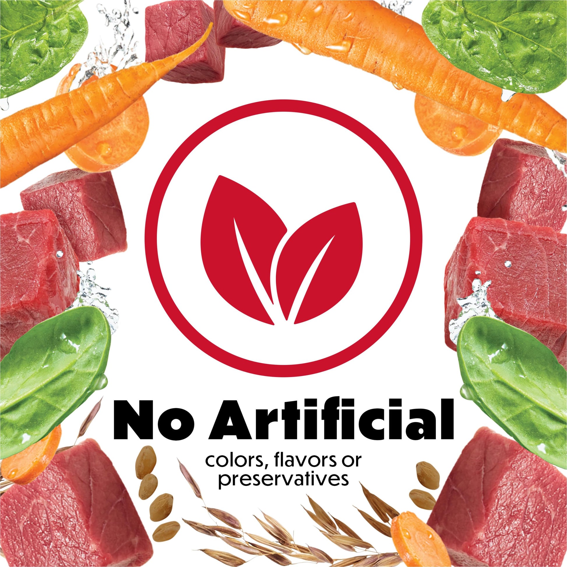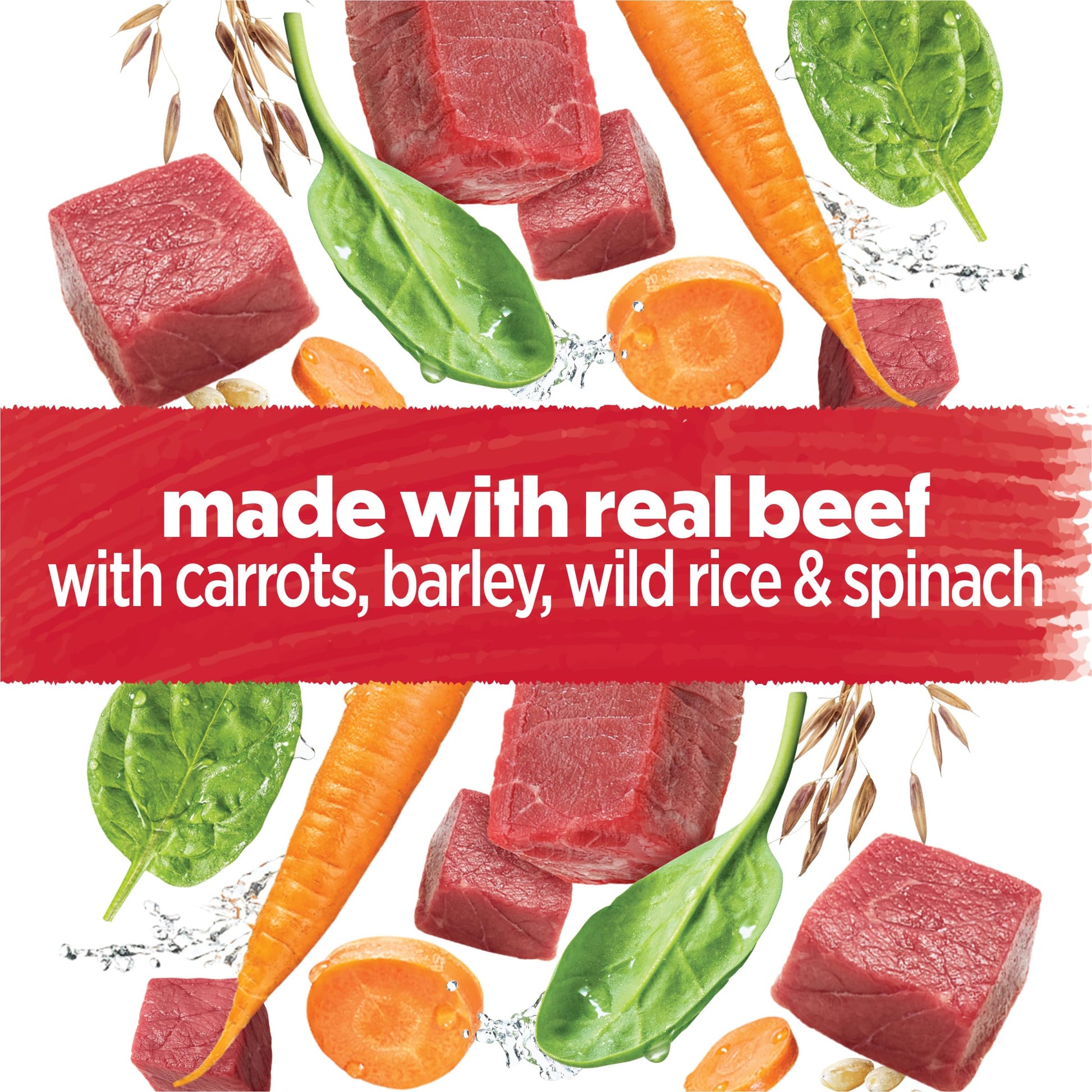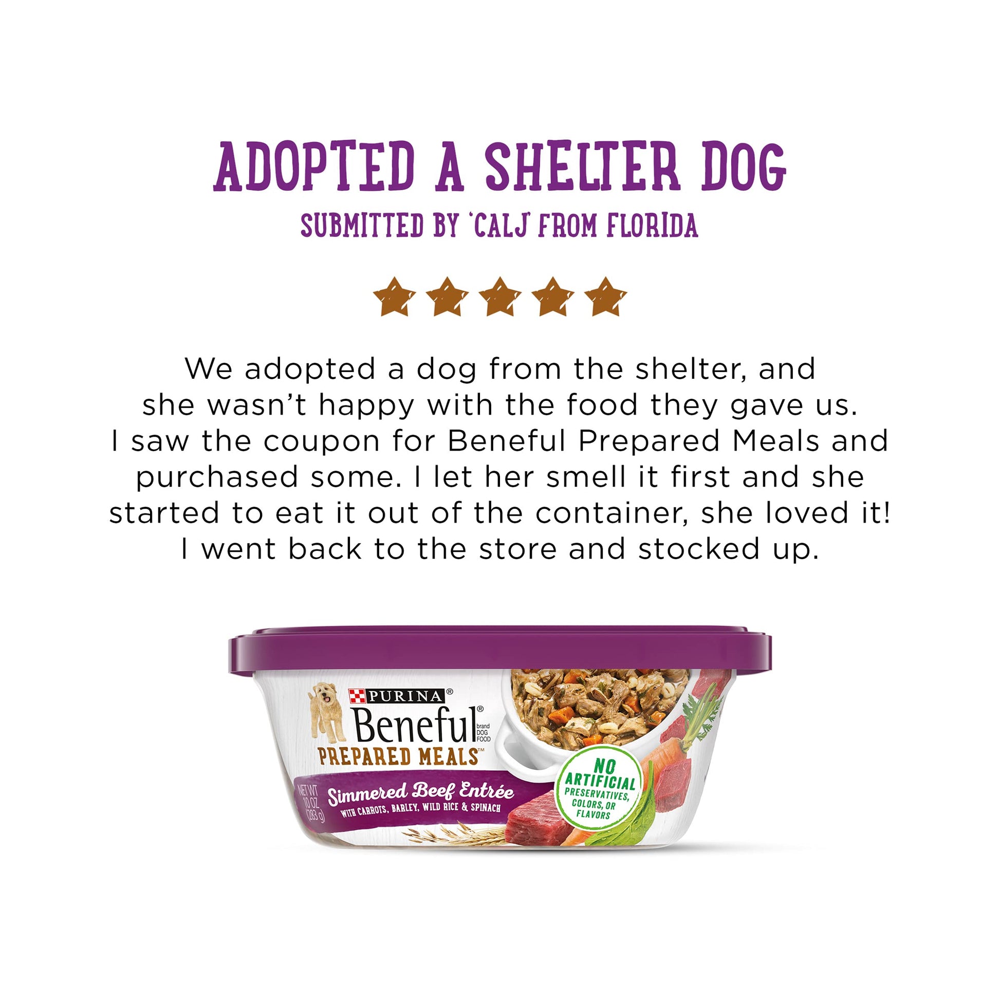 Details: Make mealtime more convenient when you serve your dog Purina Beneful Prepared Meals Simmered Beef Entree wet dog food. Savory chunks with real beef in our high-protein dog food recipe with no artificial colors, flavors or preservatives give your canine companion something to sink his teeth into while helping supply high-quality protein to support strong muscles. Crafted with carrots, barley, wild rice and spinach you can see, along with 23 essential vitamins and minerals, this premium dog food with gravy provides a 100 percent complete and balanced meal for your adult dog. When you open a tub of Purina Beneful Prepared Meals Simmered Beef Entree wet dog food, your best buddy is sure to love the tasty dog food gravy in every serving. We proudly produce Beneful wet dog food in Purina-owned, U.S. facilities and package each meal in a recloseable dog food tub to make it easy to store leftovers.