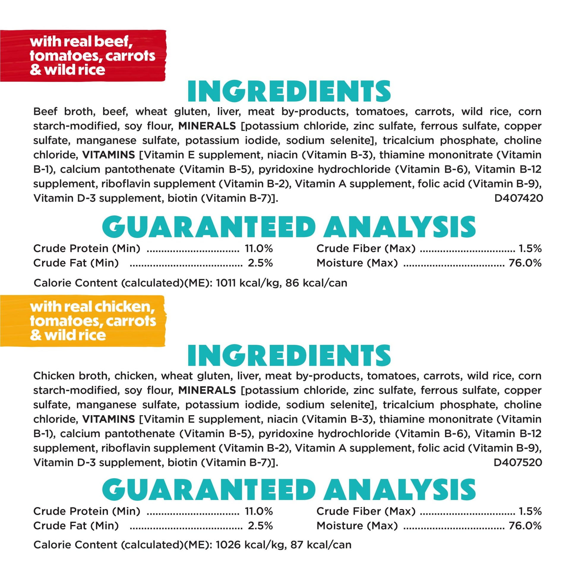 Details: our small dog will enjoy the big flavor adventures in this Purina Beneful Small Breed Wet Food Dog Gravy Variety Pack, IncrediBites With Real Beef, Chicken and Salmon. This canned dog food variety pack is specially crafted to delight little dogs. Each tender bite of this real meat dog food is paired with dog food gravy to satisfy their tiny taste buds and big cravings. Made to support strong muscles, this Beneful Incredibites for small dogs is packed with 23 essential vitamins and minerals, delivering 100 percent complete and balanced nutrition. This wet food for dogs is made with real vegetables and crafted to promote overall health. Purina Beneful Small Breed Wet Food Dog Gravy Variety Pack, IncrediBites With Real Beef, Chicken and Salmon is conveniently packaged in 3-ounce cans—the perfect meal portion for small dogs. This Purina Beneful wet dog food is proudly produced in Purina-owned U.S. facilities and contains no artificial colors, flavors, or preservatives.