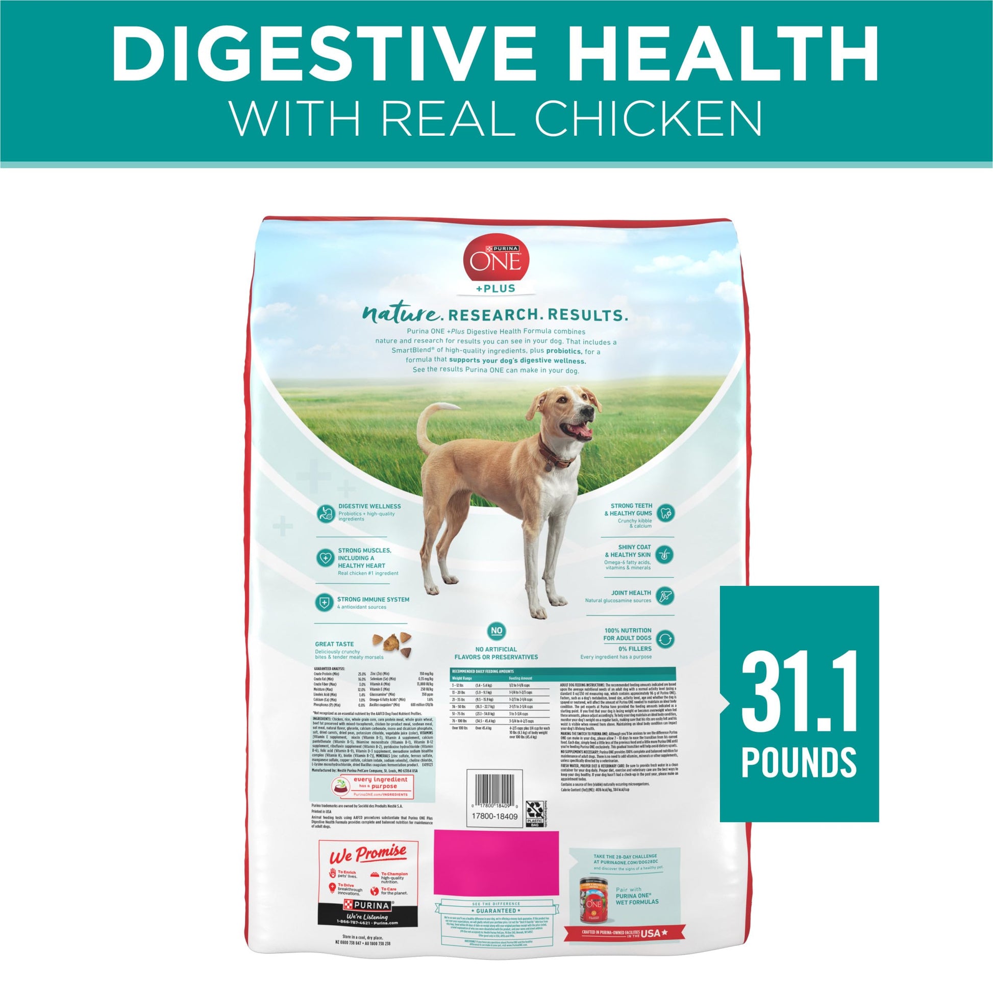 Details: Fill your dog's bowl with Purina ONE +Plus Natural Digestive Health Chicken and Rice Formula with added vitamins, minerals and nutrients adult dry dog food. Real chicken is the first ingredient, and the protein-rich morsels support his muscles, including a healthy heart. Purina ONE sensitive stomach dog food is highly digestible and contains a SmartBlend of high-quality ingredients enriched with probiotics to support digestive wellness. We make our digestive care dog food with omega-6 fatty acids to nourish his skin and coat, and a blend of four antioxidants, including vitamins E and A, plus the minerals zinc and selenium help support immune health. Your dog is getting a Purina dog food with no artificial flavors or preservatives and no fillers. Plus, the great-tasting kibble has calcium to support your dog's strong teeth and healthy gums. Ensure your dog gets 100 percent complete and balanced nutrition crafted by a veterinarian-recommended brand with this tasty dog dry food.