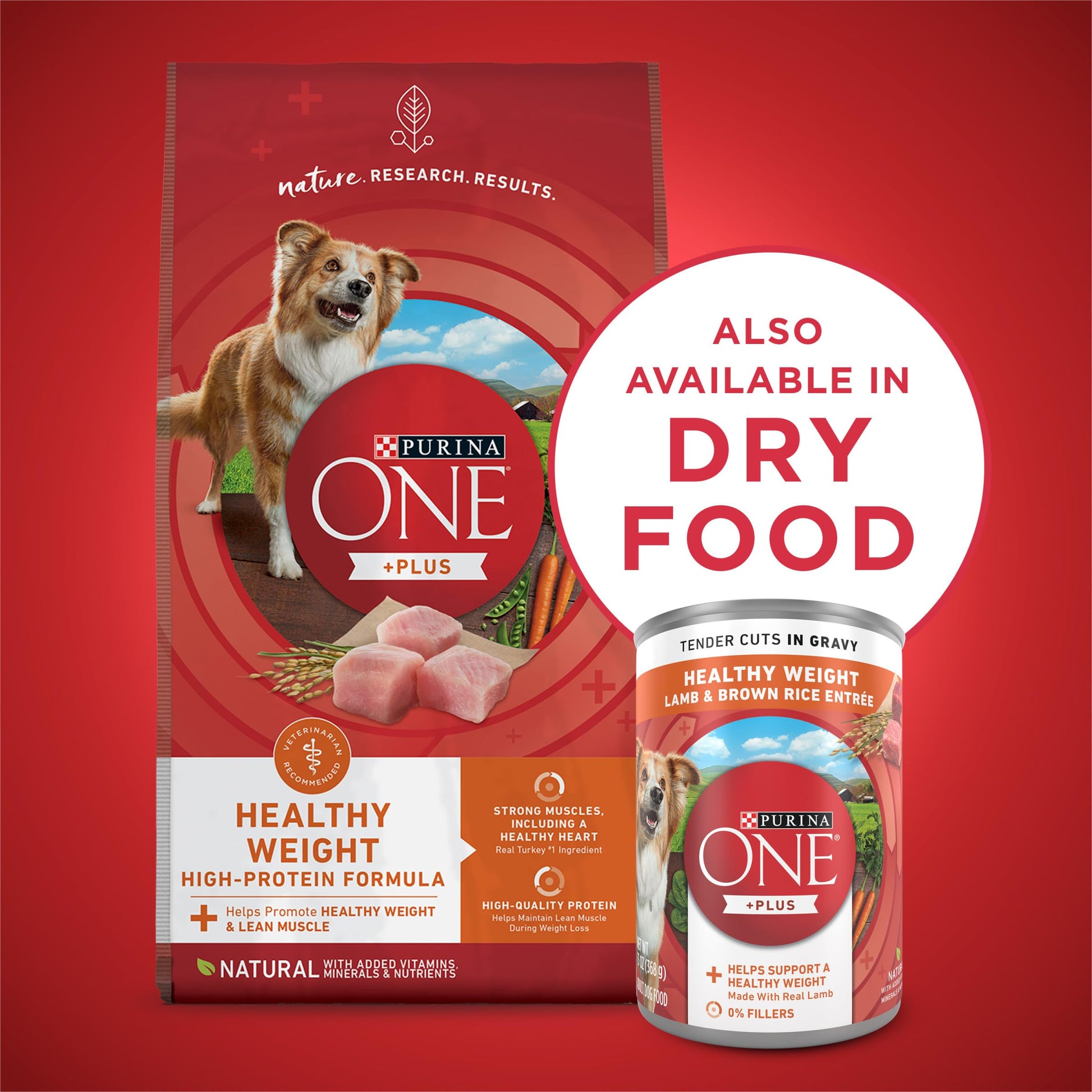 Details: Indulge your dog's cravings for savory flavor with Purina ONE +Plus Tender Cuts in Gravy Healthy Weight Natural Lamb and Brown Rice Entree adult wet dog food with added vitamins, minerals and nutrients. This adult dog food made with real lamb and brown rice provides 100 percent nutrition for adult dogs with 0 percent fillers and no poultry by-products. Every high-quality ingredient has a purpose. Delicious dog food gravy balances out the recipe for added flavor and moisture. Our dog food formula helps your dog achieve and maintain a healthy weight for an optimal body condition, while the high protein helps support his strong muscles. Plus, tender, meaty cuts deliver a tempting texture, and the 100 percent complete and balanced nutrition helps support your adult dog's whole-body health. Give your faithful friend a tasty wet dog food gravy meal by filling his bowl with this Purina canned dog food, and show him how important his health and happiness are to you.