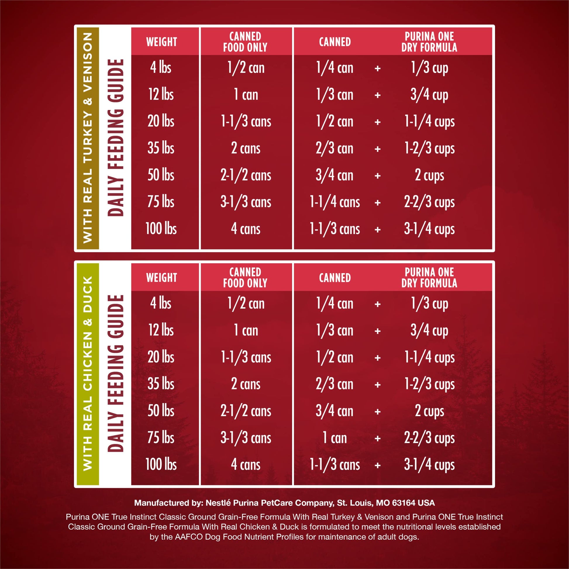 Details: Deliver delicious goodness to your dog's bowl with this Purina ONE True Instinct Classic Ground Natural Grain-Free adult wet dog food variety pack with added vitamins for dogs, minerals and nutrients. Each pack contains two different nutrient-dense, high protein dog food recipes with real poultry as the number one ingredient. We formulate each Purina canned dog food recipe with other flavorful, quality proteins, including real venison and duck. The grain free wet dog food varieties are made with no artificial colors or flavors and contain no fillers or poultry by-products, so every ingredient serves a purpose. Give 100 percent complete and balanced nutrition to your adult dog by offering selections from the Purina ONE True Instinct adult dog food variety pack, and watch as he delights in the tender, meaty texture in every mouthwatering serving.