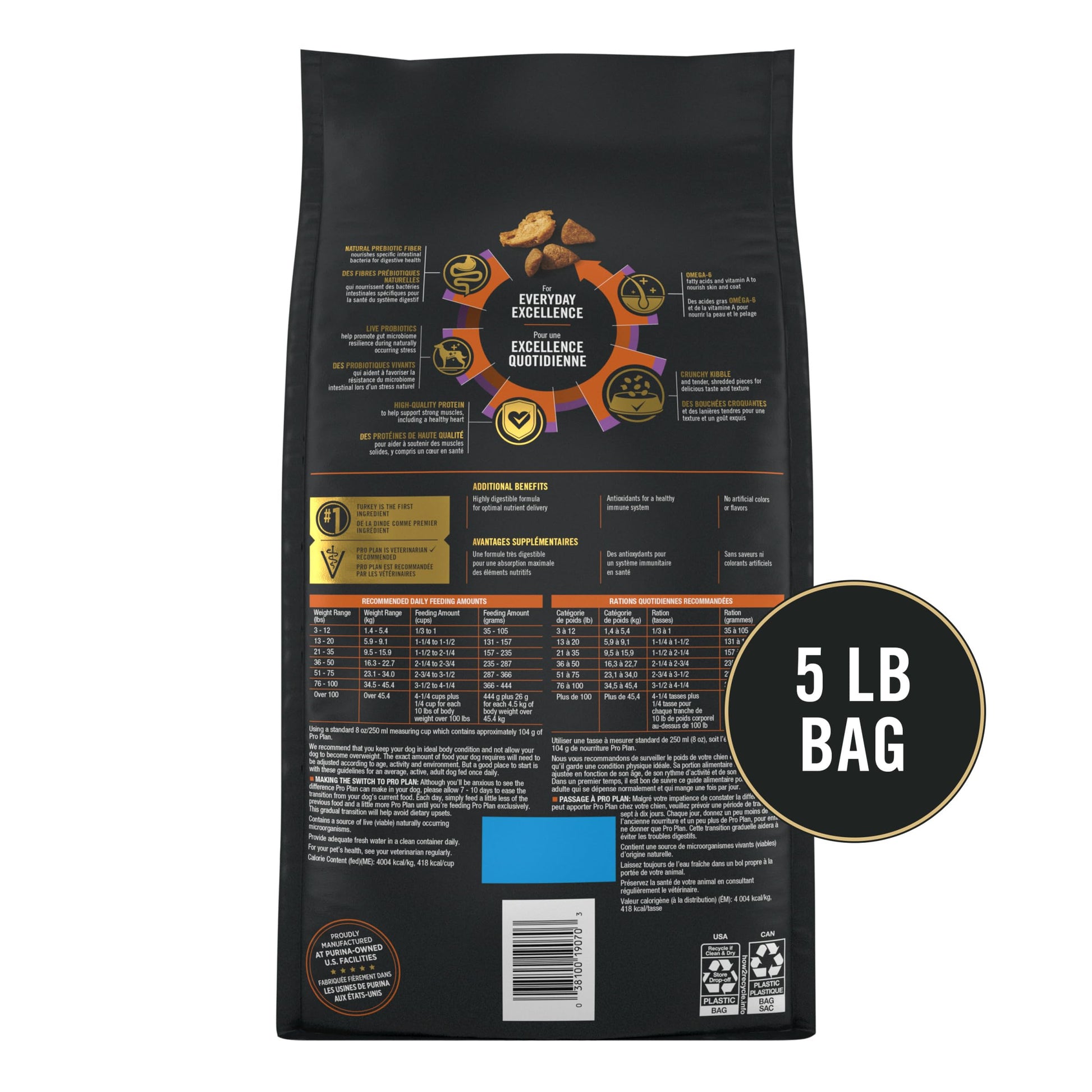 Details: Give your dog a mix of great taste and outstanding nutrition with Purina Pro Plan COMPLETE ESSENTIALS Shredded Blend Turkey and Rice adult dry dog food. A combination of crunchy dog food kibble and tender, shredded pieces delivers delicious taste and texture. Real turkey is the number 1 ingredient, laying the foundation for a super premium shredded dog food. Made with no artificial colors or flavors, this tender dog food includes high-quality ingredients carefully chosen for a specific nutritional or functional purpose. We use sunflower oil, rich in omega-6 fatty acids, and vitamin A to help maintain his skin and coat. Guaranteed live probiotics for dogs help promote his digestive health, and natural prebiotic fiber in our digestive dog food also nourishes beneficial intestinal bacteria. Our high-quality dog food with rice is highly digestible to ensure optimal nutrient delivery, and each serving contains a high level of protein to help your adult dog maintain an ideal body condition.