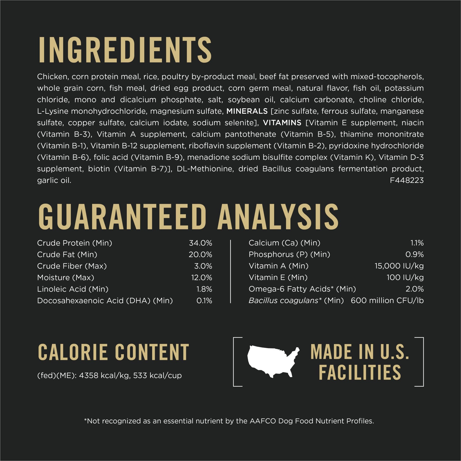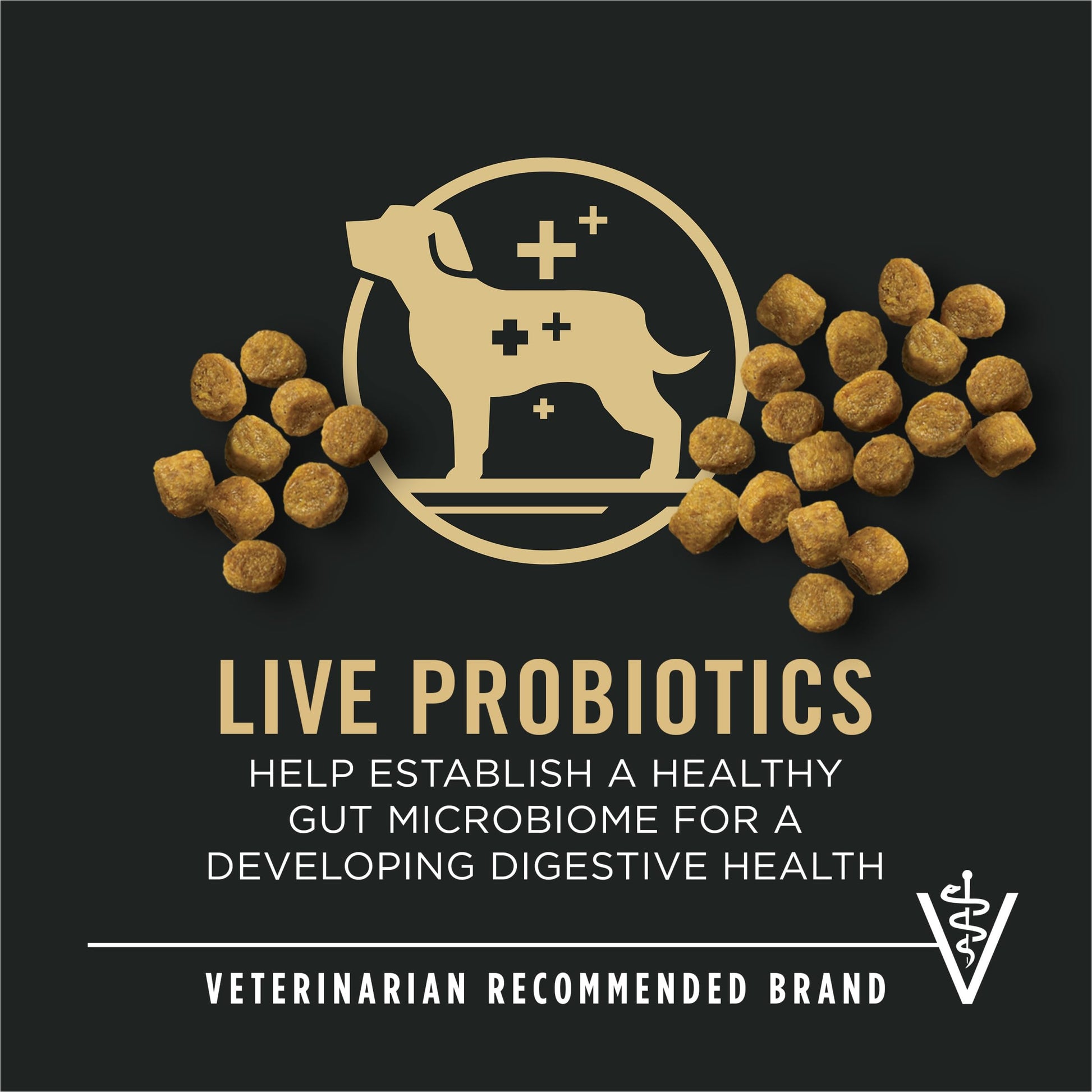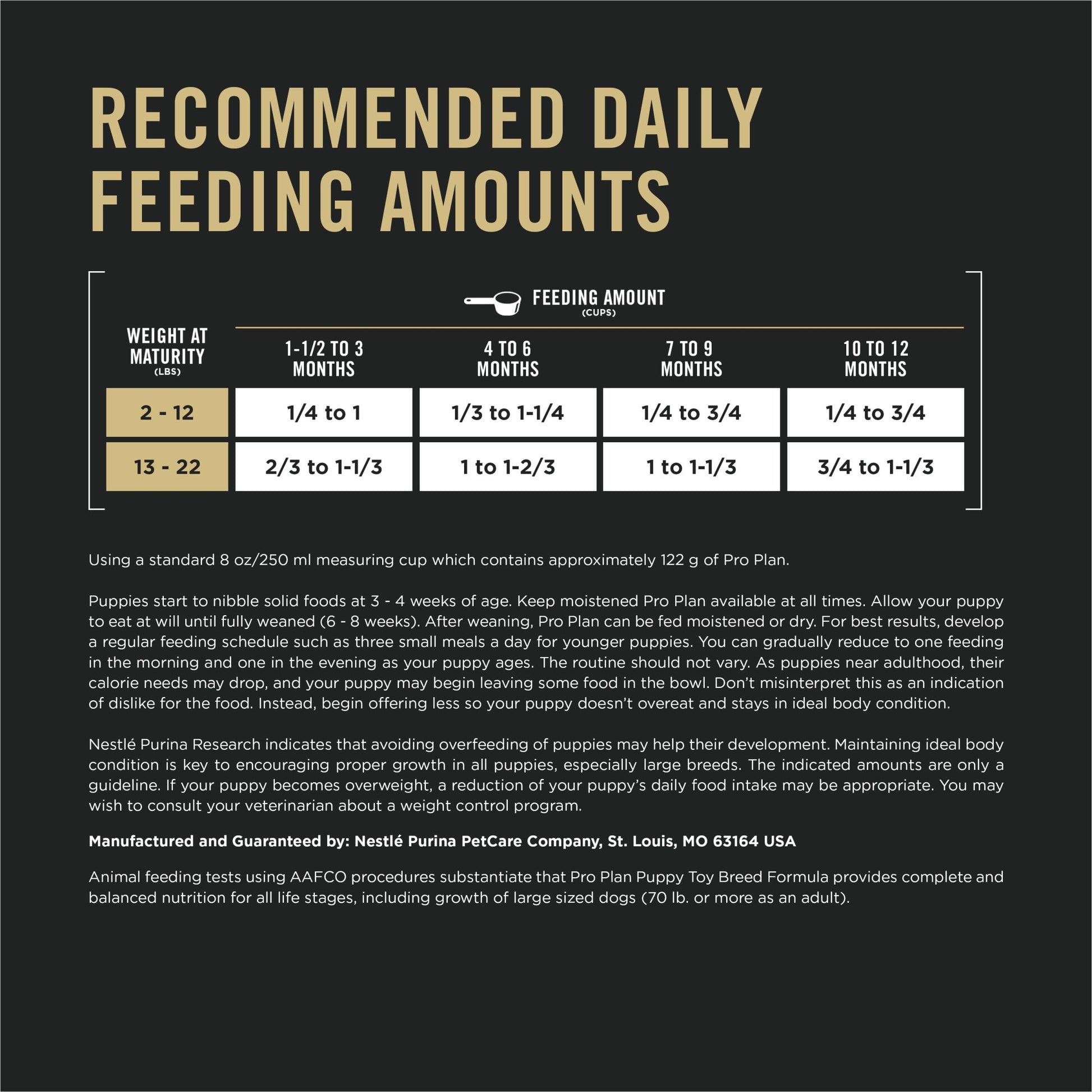Details: Care for your growing toy breed puppy's unique nutritional needs by serving him Purina Pro Plan Brand Dog Food Puppy Toy Breed Chicken and Rice Formula dry puppy food. Formulated for puppies weighing under 10 pounds at maturity, this small breed dry puppy food helps support his overall health and wellness through this important early life stage. High-quality protein, including real chicken as the number 1 ingredient, provides some of the essential nutritional building blocks within his little body. We fortify this small puppy kibble with guaranteed live probiotics for dogs to support his digestive and immune health. This super-premium small puppy food nourishes his brain and vision development with DHA from fish oil, while calcium, phosphorus and other minerals build strong bones and teeth. Our highly digestible dry food for puppies promotes nutrient bioavailability to deliver optimal nutrient absorption so your puppy gets the most out of every bowlful of bite-sized pieces of crunchy kibble.