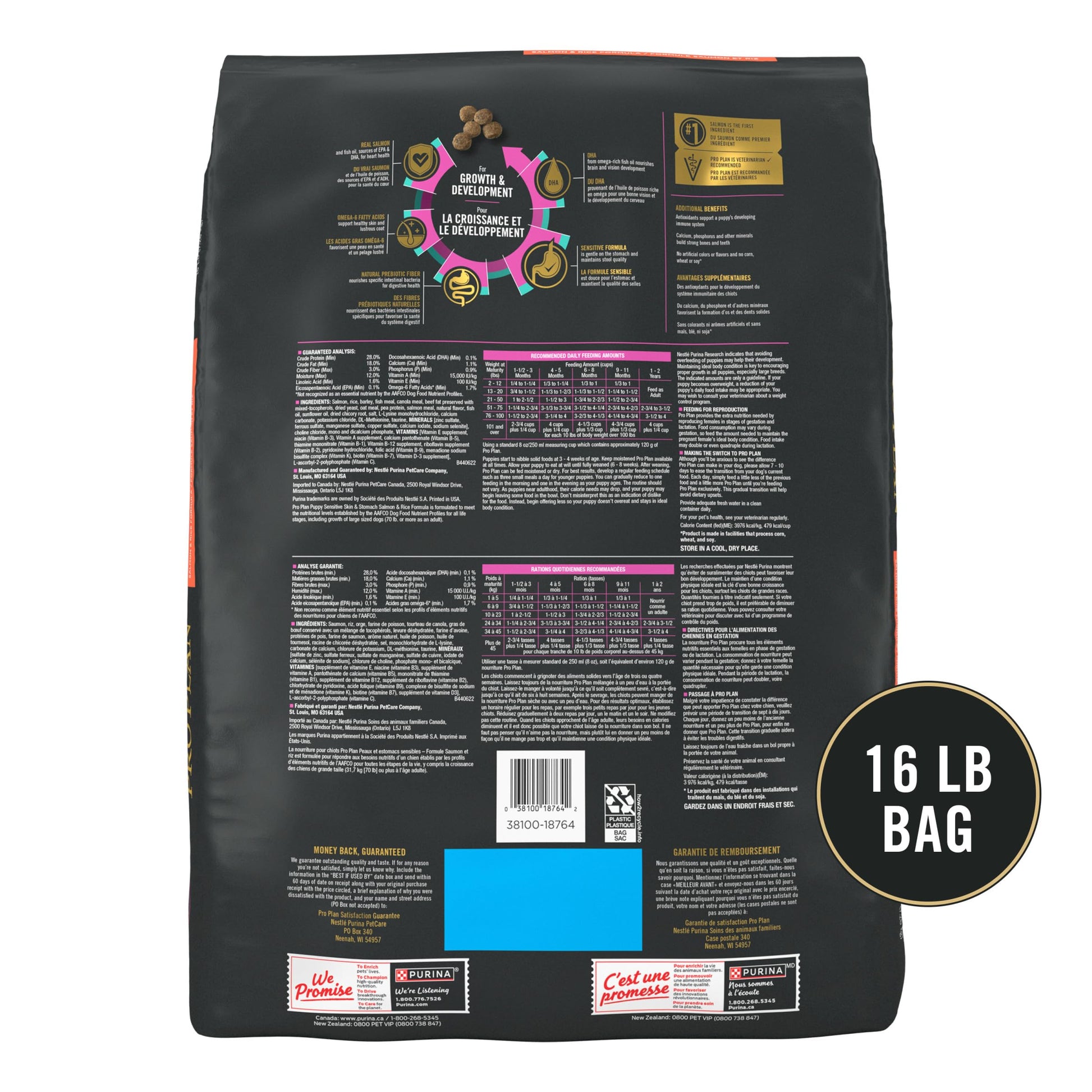 Details: Provide specialized nutrition designed to support your puppy's healthy development with Purina Pro Plan Puppy Sensitive Skin and Stomach Salmon and Rice Formula dry puppy food. This puppy kibble features salmon as the first ingredient and rice, which is gentle on his sensitive stomach. We carefully choose every high-quality ingredient in our sensitive skin and stomach dog food for a specific nutritional or functional purpose and don't use artificial colors or flavors. Sunflower oil provides a rich source of omega-6 fatty acids, and vitamin A supports his skin and coat. DHA, from omega-rich fish oil, nourishes his brain and vision development, while antioxidants support immune health. We fortify our Purina Pro Plan puppy food with guaranteed live probiotics to support digestive and immune health and include natural prebiotic fiber to nourish specific intestinal bacteria. To help build strong bones and teeth, this puppy food with probiotics also has calcium, phosphorus and other minerals.