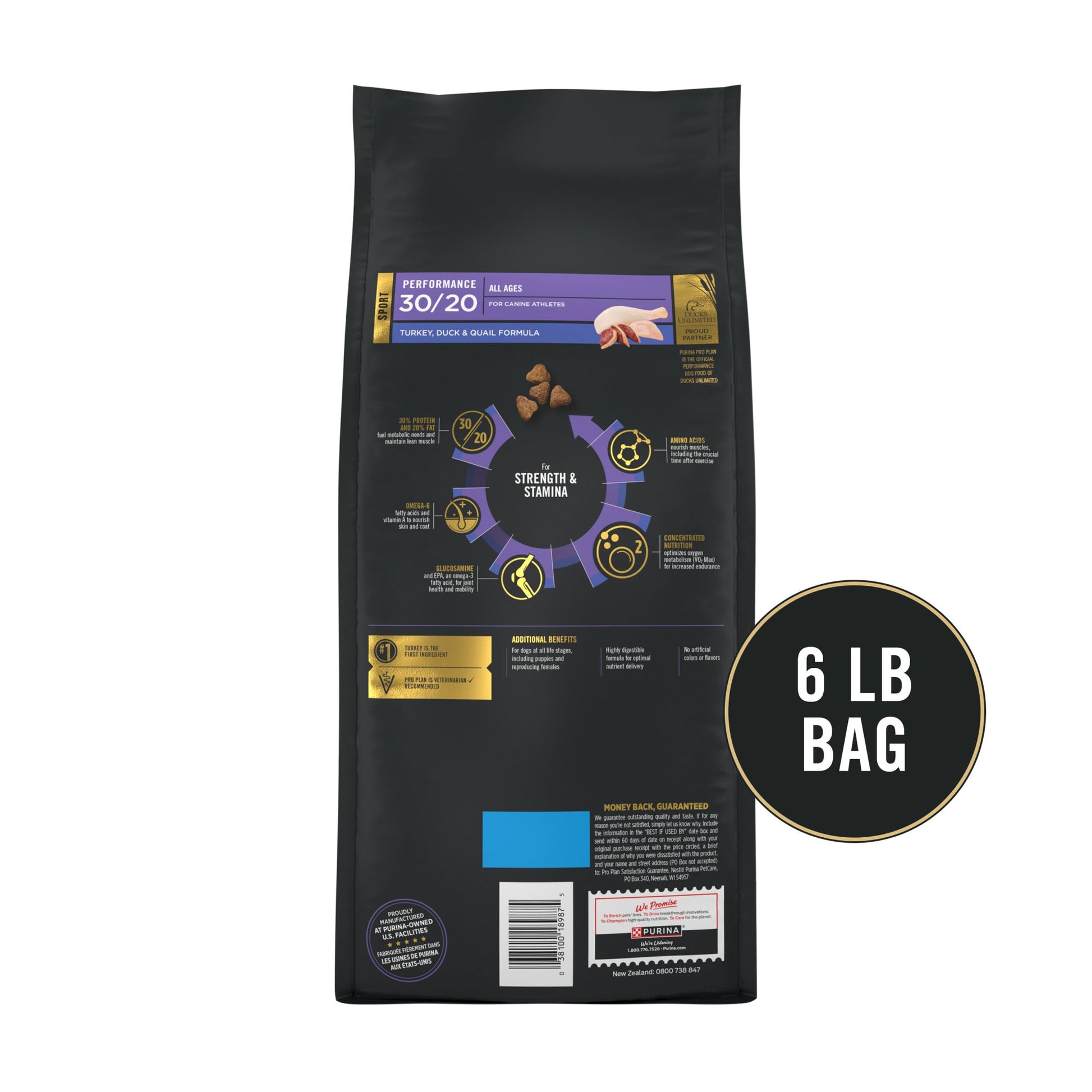 Details: Provide your athletic dog with 100 percent complete and balanced nutrition with Purina Pro Plan Sport Performance 30/20 Turkey, Duck and Quail Formula. Ideal for highly active dogs such as competitive canine athletes, sporting, hunting and working dogs, this fine-tuned, high protein dog food provides concentrated nutrition to help optimize oxygen metabolism for enhanced endurance. Containing a ratio of 30 percent protein and 20 percent fat to assist in caring for your canine’s metabolic needs and maintain his lean muscles, this turkey dog food is enriched with EPA, an Omega-3 fatty acid, and glucosamine for joint health and mobility. Amino acids will help nourish his muscles including during the critical time directly after exercising, while Omega-6 fatty acids and Vitamin A will nourish his skin and coat. Plus, as the official performance dog food of Ducks Unlimited, you’re offering your champion fine-tuned nutrition in every bowl.