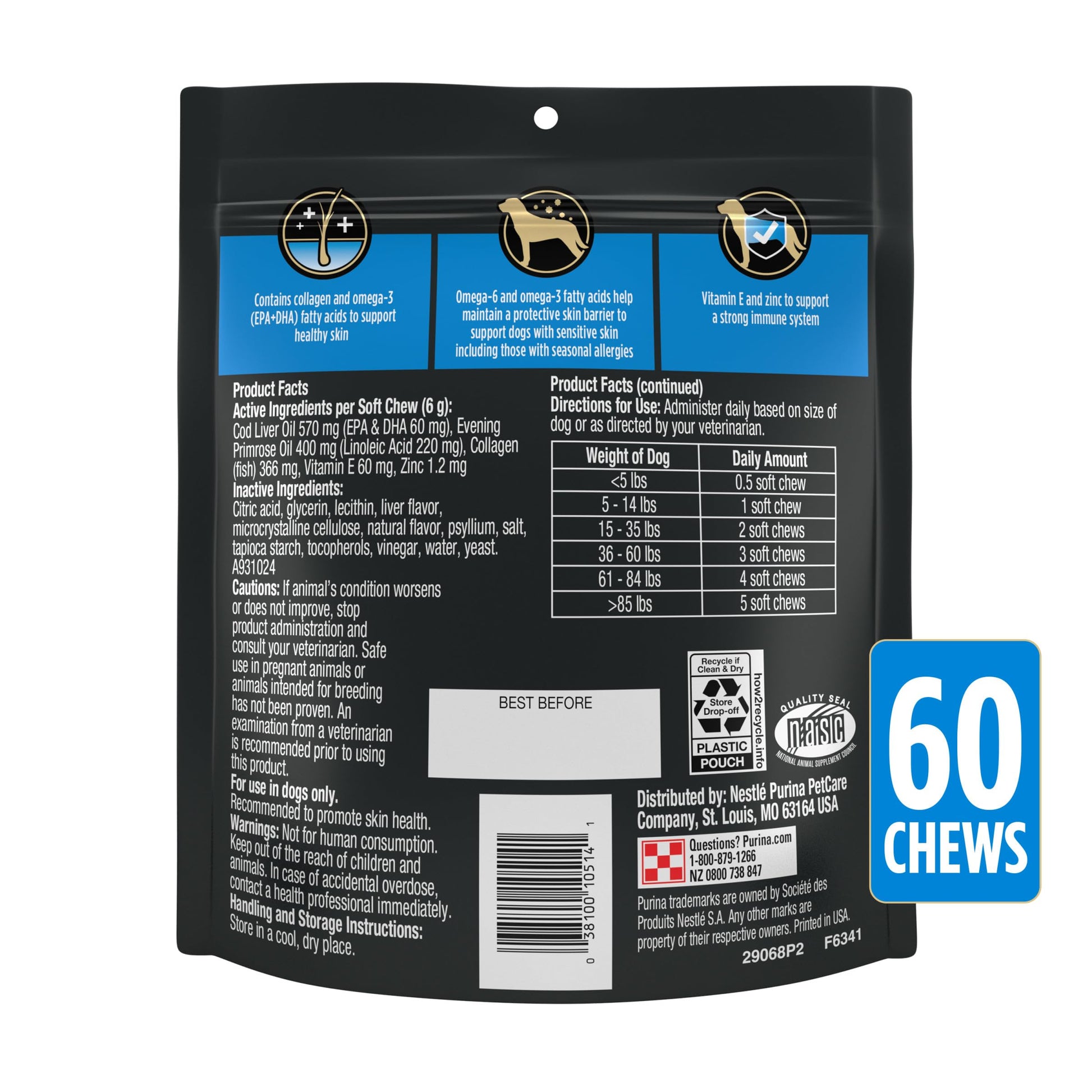 Details: If your dog has sensitive skin, talk to your doctor about adding Purina Pro Plan Veterinary Supplements Skin Care Dog Food Supplements With omega-3 Fish Oil and EPA and DHA to his daily routine. These skin care supplements for dogs feature collagen, EPA and DHA, vitamin E, and zinc, which proactively support dogs’ skin health, including dogs with sensitive skin. Omega-6 (linoleic acid) and omega-3 (EPA and DHA) fatty acids in these dog chews help the skin maintain its natural protective barrier. Meanwhile, the antioxidant vitamin E provides antioxidant support, while zinc offers your dog immune support. You can be assured that these sensitive skin dog food supplements are high quality, as they have earned the NASC Quality Seal, meaning they are Certified by the National Animal Supplement Council (NASC) for meeting the highest quality and compliance standards for pet supplements. Feel good serving dog skin care supplements produced in USA facilities with quality and safety you can trust.