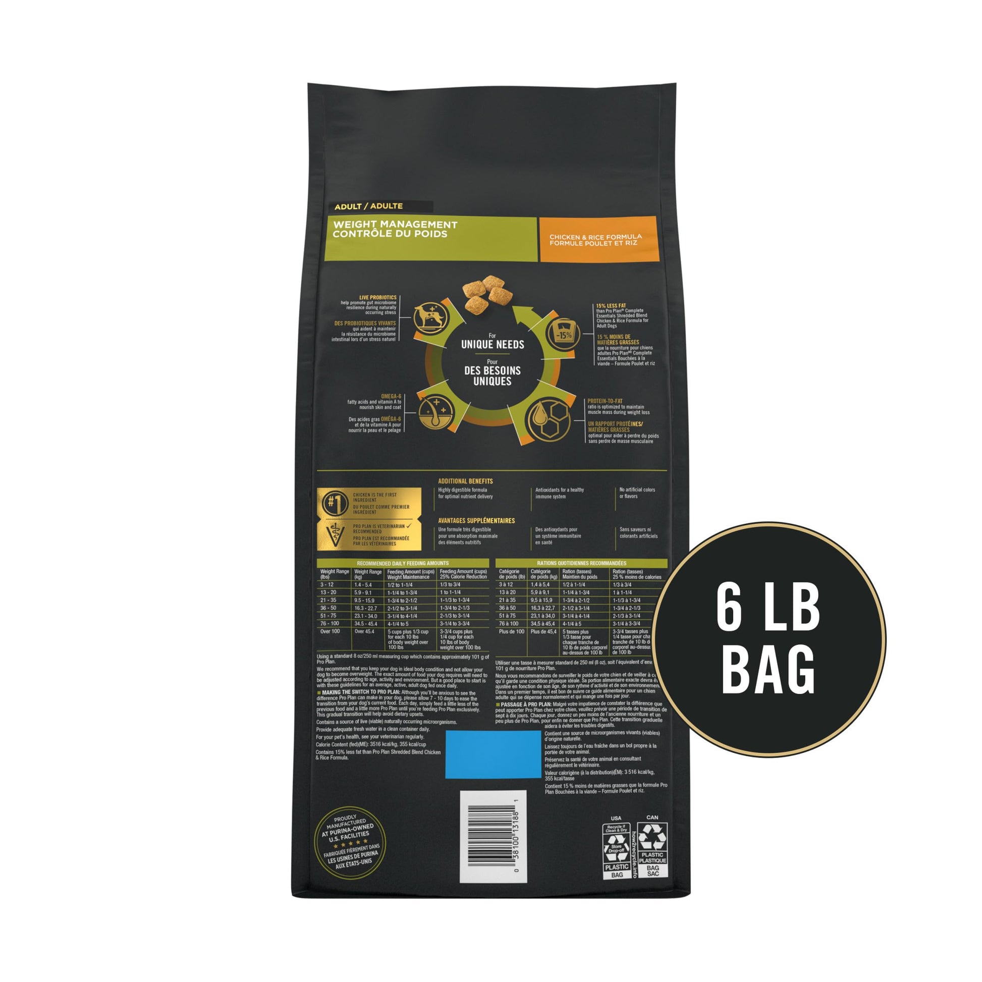That’s why we want to do more to give back to our dogs in every way we can.Pro Plan® Shredded Blend Weight Manage Formula is made with real chicken as the #1 ingredient, in a savory combination of hard kibble and tender, shredded pieces--for high-quality nutrition and a taste dogs love. To help your dog lose excess weight and maintain a healthy size, this formula features an optimal protein to fat ratio that helps dogs lose fat, not muscle.Pro Plan® Shredded Blend Weight Management Formula Supports:Healthy Weight MaintenanceWith 25% less fat than Pro Plan Shredded Blend Chicken & Rice Formula for adult dogs.Muscle Mass MaintenanceHigh levels of protein help protect muscle mass during weight loss.Healthy HeartHigh-quality protein along with essential vitamins and minerals.Strong Immune SystemComplete nutrition with high levels of antioxidants, natural milk proteins and additional quality protein including real chicken.Healthy Digestive SystemWith natural prebiotic fiber from whole wheat bran.Optimal Nutrient AbsorptionHighly digestible formula so dogs receive optimal nutrition from food with less going to waste.Radiant Skin and CoatWith vitamin A and high-quality protein combined with linoleic acid, an omega-6 fatty acid.Strong Teeth and BonesWith calcium, phosphorus, and other minerals--as well as a hard kibble texture that helps reduce plaque build-up on teeth.Exceptional FlavorWith high-quality ingredients, beginning with real chicken, as the #1 ingredient.About Pro Plan® from Purina®