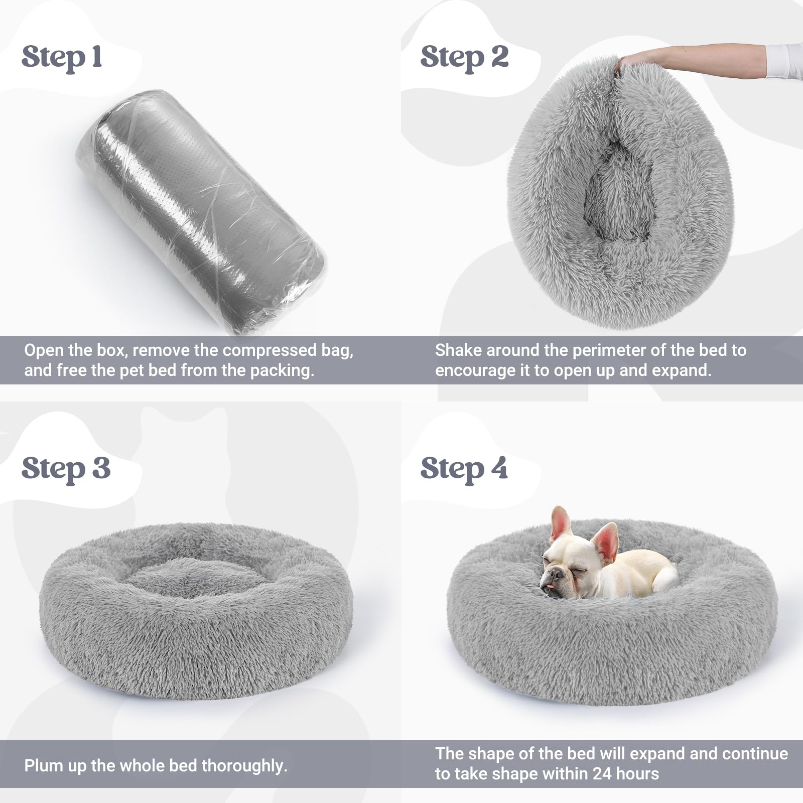 rabbitgoo Calming Dog Bed for Small Medium, 27 inches Pet Bed Machine Washable, Non-Slip Round Fluffy Plush Faux Fur, Soft Donut Cuddler Cushion for Small Dogs, Light Grey