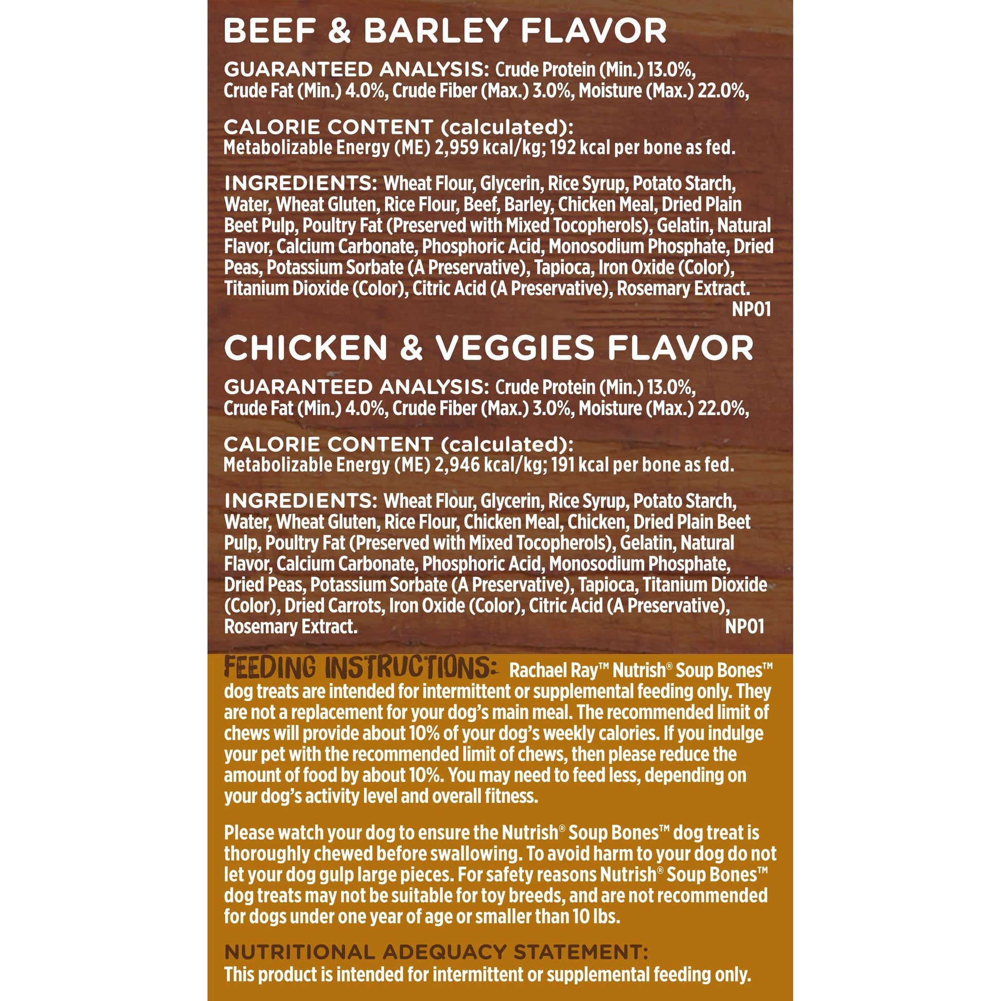 - Contains two (2) 11-count bags of Rachael Ray Nutrish Soup Bones Long Lasting Dog Chews: 1 bag of Real Beef & Barley bones and 1 bag of Real Chicken & Veggies bones