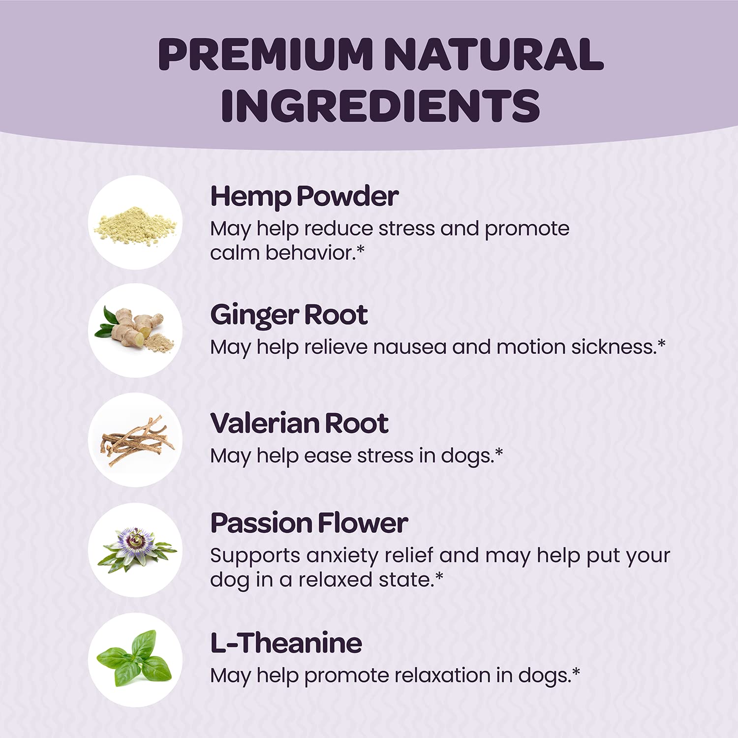- Natural dog calming aid. Premium Formula with Hemp, Magnesium, L-Theanine, L-Tryptophan, and a calming herb blend, these dog calming treats support dog anxiety relief and overall calm behavior.