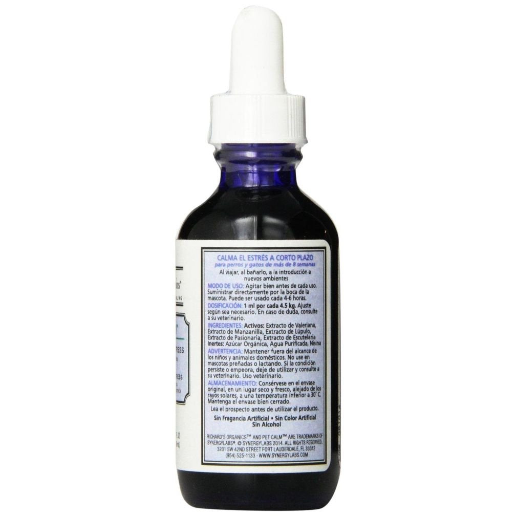Details: "Richard’s Organics Pet Calm has been naturally relieving stress and anxiety in dogs and cats for almost 20 years. Even the most relaxed dogs and cats can become stressed in certain situations. Whether it’s trips to the vet, grooming, car rides or thunderstorms, when our pets become stressed and anxious, they could become hyperactive, destructive, and cause everyone in the house to sleep poorly. This 100% natural active ingredients formula for cat and dog relaxation is gentle, yet effective, and makes your pet more mellow, calm and relaxed. The medicinal properties of the ingredients, including valerian root extract, chamomile, skullcap extract and passionflower extract, are proven to relieve pet stress, including separation anxiety in dogs and cats, and promote healthy sleep. Available in a 2 or 4 oz. bottle, Richard’s Organics Pet Calm are relaxing drops for dogs and cats that can be administered straight from the dropper. Pets love the taste of this calming supplement, and you will love how formerly anxiety-causing events are less stressful for everyone. Unlike prescription medications, Richard’s Organics Pet Calm is drug-free and won’t cause your pet to be overly sleepy or lethargic. We know that your dogs and cats are more than just pets - they are part of the family - so Richard’s Organics designs premium wellness and healing products that pet parents can actually afford. Your pet will feel fast acting relief from stress and anxiety, and you will love how calm your pet can be even in anxiety-causing circumstances – making you both happy and able to focus on the more important things like walks, games and snuggles."