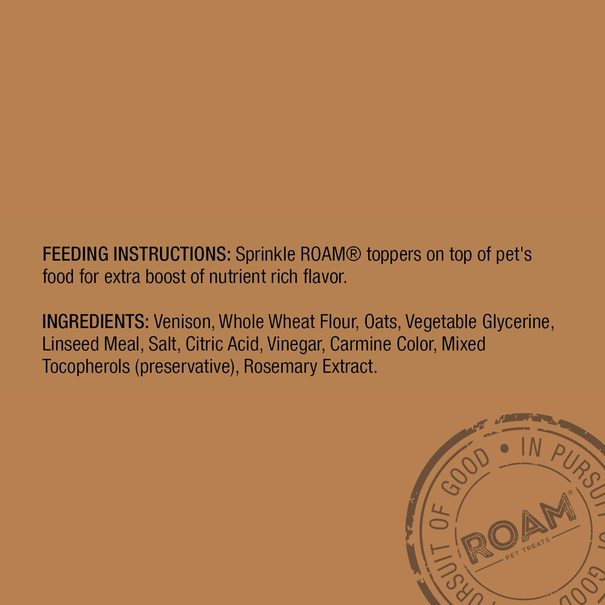 - A JOURNEY IN PURSUIT OF GOOD – ROAM is an extraordinary journey in pursuit of good, inspired by our world’s most special ingredients, people, and places. Supporting communities in need, our environment, and animal welfare, ROAM’s dog treats are reserved for pets who truly do good.
