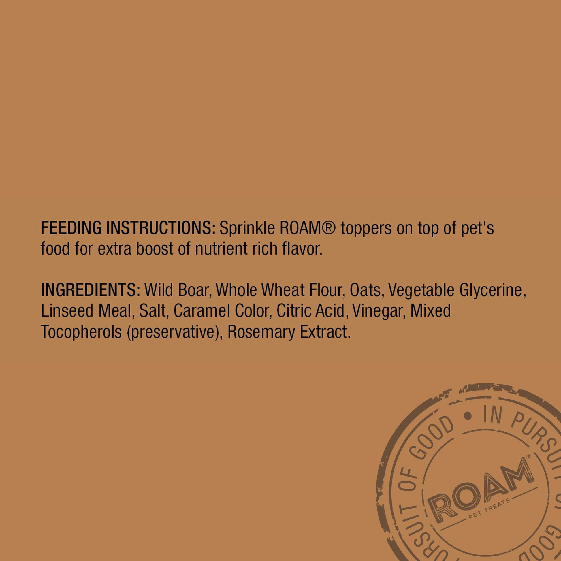 - A JOURNEY IN PURSUIT OF GOOD – ROAM is an extraordinary journey in pursuit of good, inspired by our world’s most special ingredients, people, and places. Supporting communities in need, our environment, and animal welfare, ROAM’s dog treats are reserved for pets who truly do good.