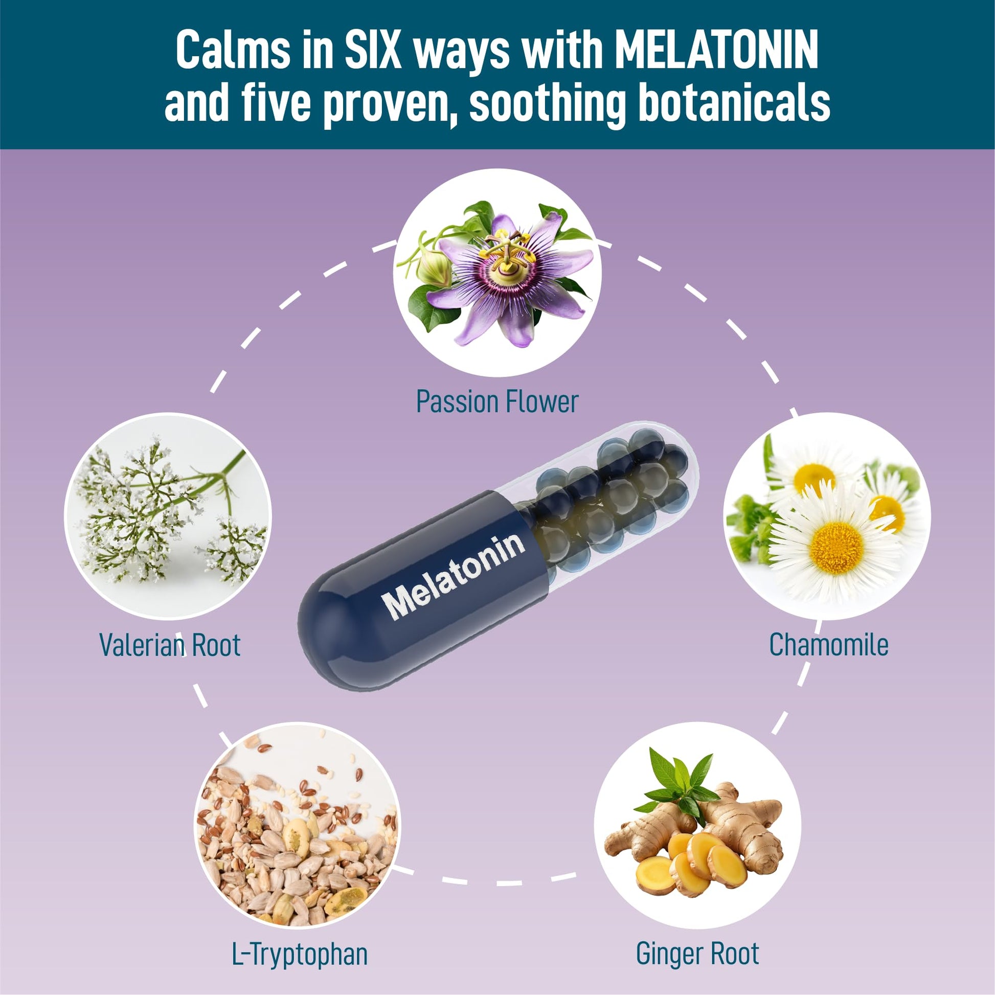 • INCLUDES MELATONIN FOR DOGS AND FIVE OTHER CALMING INGREDIENTS: With six trusted calming ingredients including melatonin for dogs; plant-based calming ingredients including chamomile flower, Passion Flower, Ginger root and Valerian root; and the amino acid L-Tryptophan for stress relief.