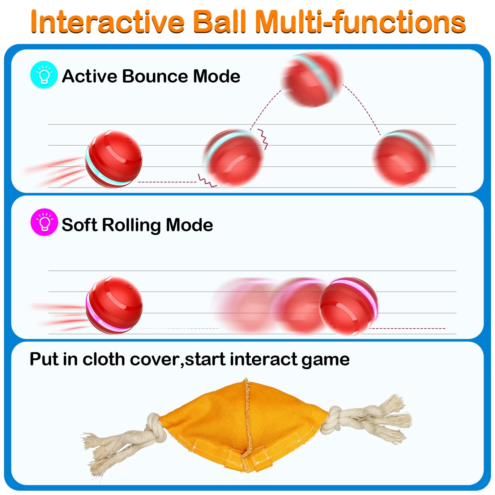 • Automatic Ball Self-playing Dog Toys : Easy to operate - Long press button to power on: Bounce mode ( Blue Mode) - the ball will automatically bounce for 2 minutes,then enter standby mode. Press second: Irregular Rolling Mode ( Purple Light) - pet toy will move rotate for 2 minutes,then enter standby mode