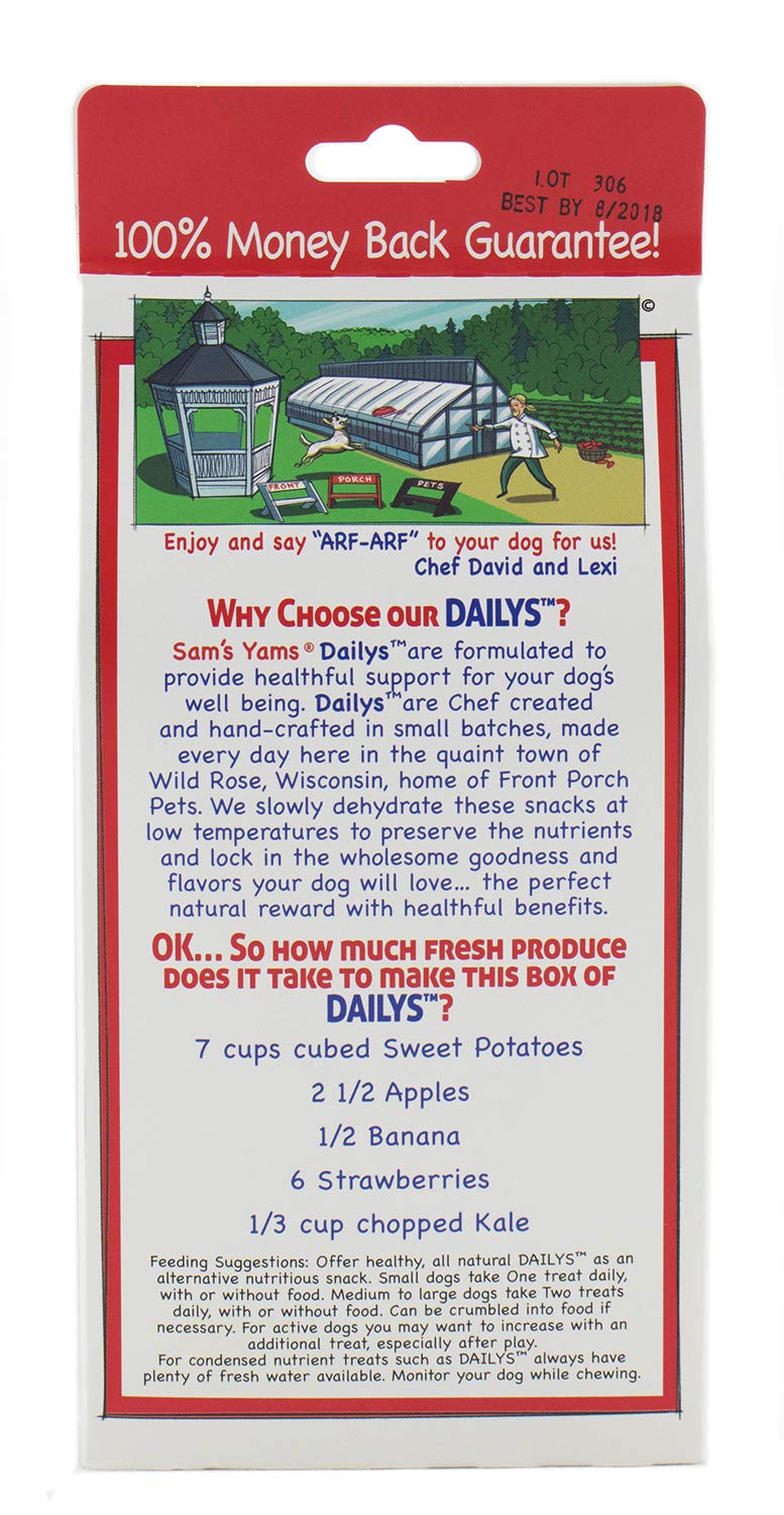 - TREAT YOUR PUP TO THE GOOD STUFF with Sam's Yams Dailys, the perfect natural reward with healthful benefits! These chef-created and crafted dog treats are made with real food ingredients, including dried sweet potato, that are healthy and nutritious for your furry BFF. No preservatives, no additives, and no added sugars, all natural - Only the finest ingredients!