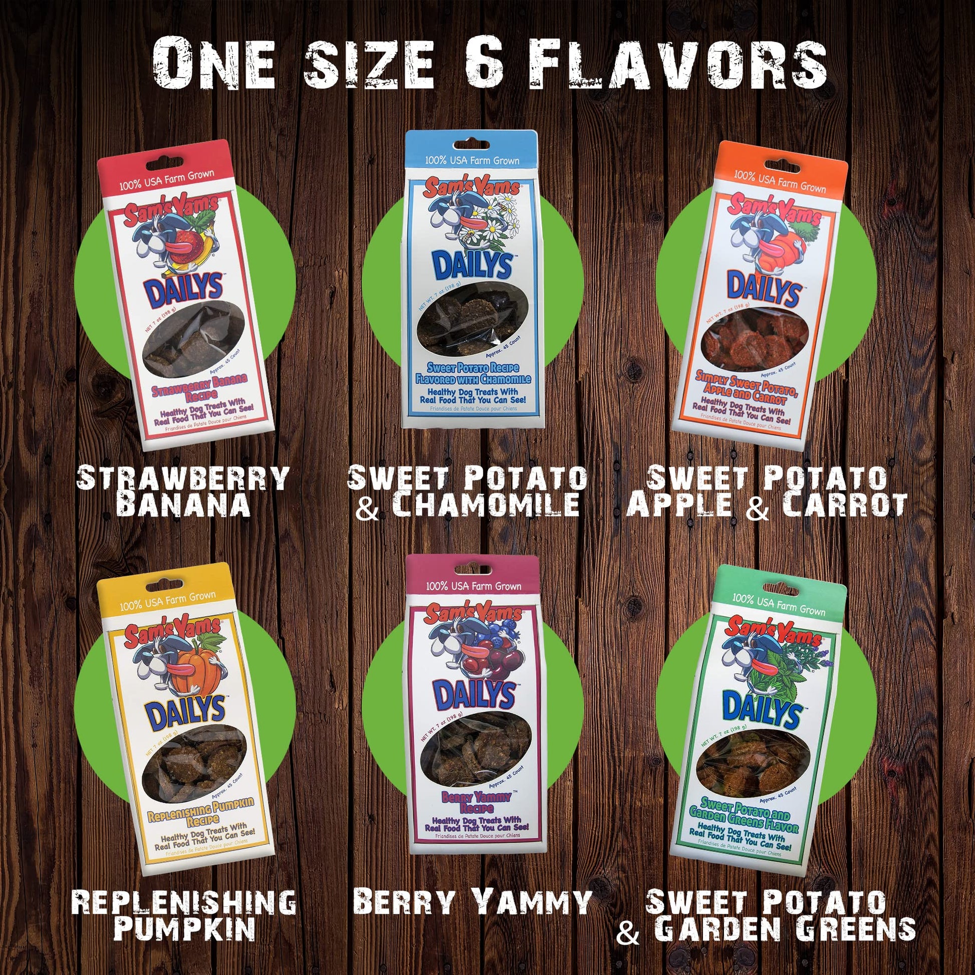 - FUR REAL QUALITY FUR YOUR FURBABIES!: Sam's Yams Daily's Strawberry Banana Recipe sweet potato treats for dogs are made with high-quality, chef-created, human-grade ingredients, and are 100% produced in the USA without grains, gluten, or glycerin. These treats are a healthy and delicious option for your furry friend.