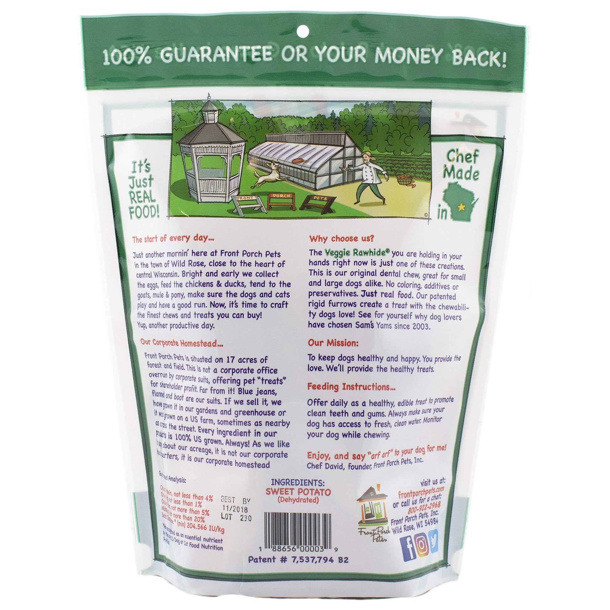 - HEALTHY DOG TREATS FOR SMALL, MEDIUM, AND LARGE DOGS: The Front Porch Pets Sweet Potato dog treat is made from 100% natural sweet potatoes, slow-roasted to perfection by a chef in the USA. This treat is grain-free, gluten-free, 100% vegan, and nutrient dense, making it a great choice for pets with dietary restrictions, no matter their size. Your furry friend will love the taste and texture of these chews!