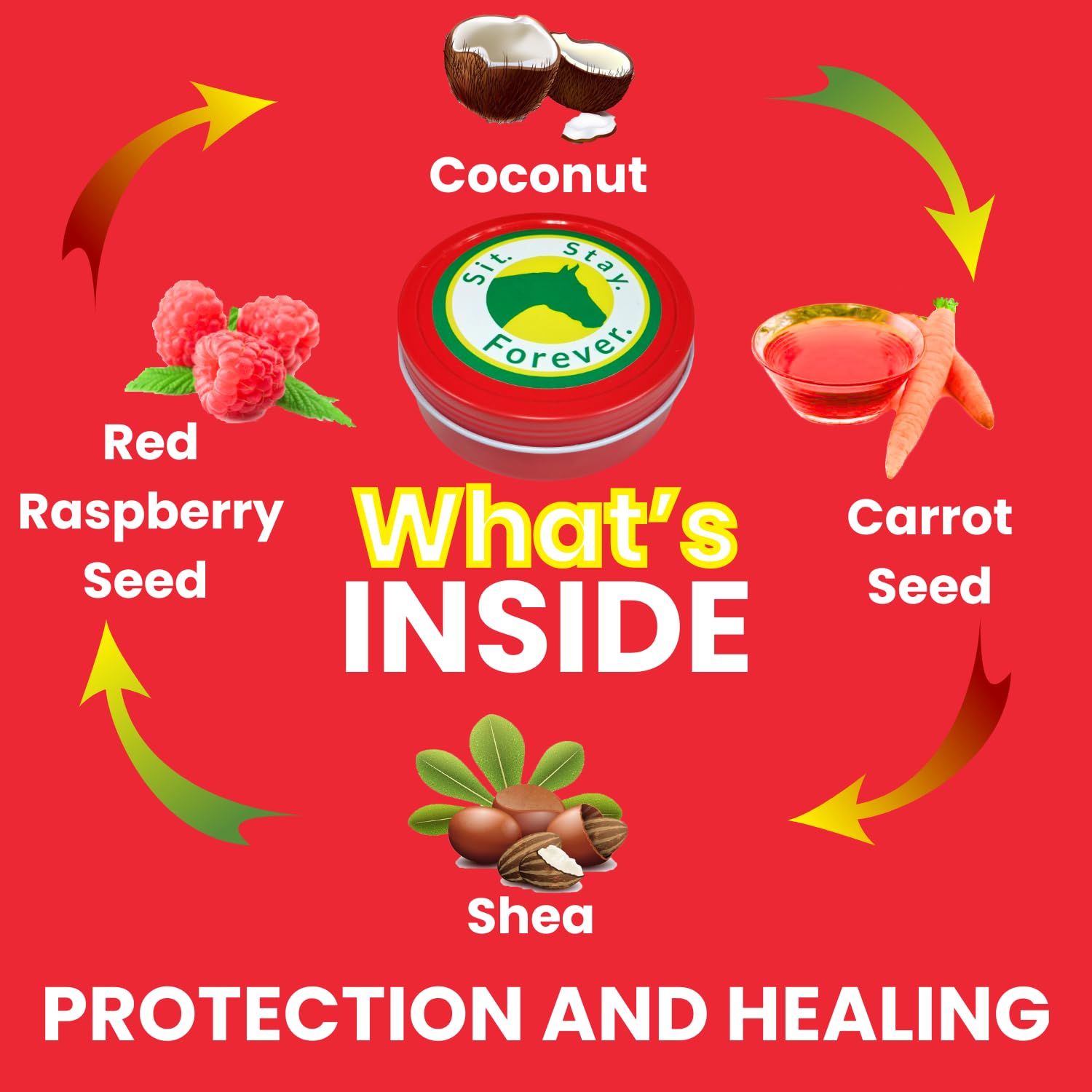 Nourishing Formula: Enriched with natural ingredients; hydrates and moisturizes while protecting; ensures your horse's skin remains soft and supple; made with organic red raspberry seed oil, carrot seed oil, and hemp oil to soothe and hydrate dry or sun-exposed skin; safe even if licked