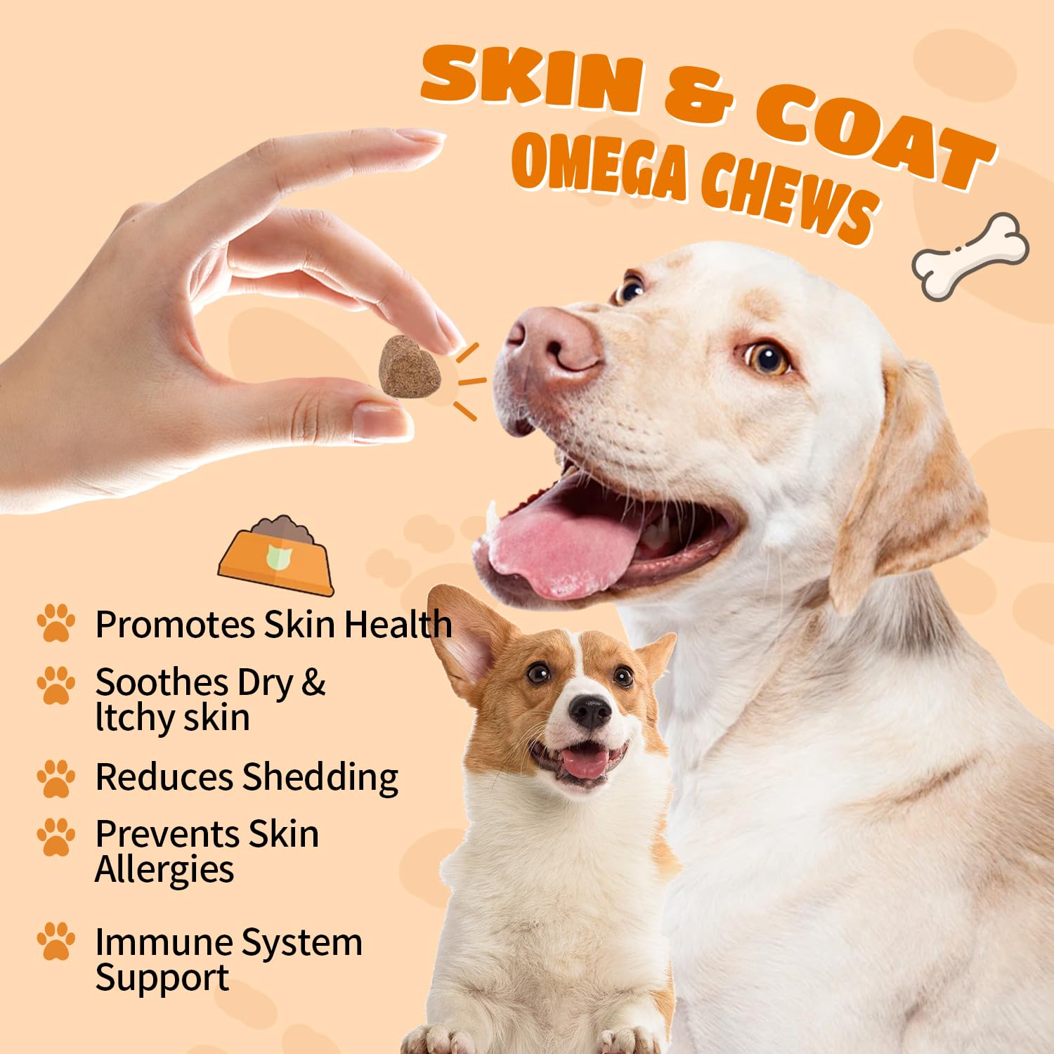 • Hip & Joint, Immunity Support Chews:In addition to skin and coat benefits, these omega-rich soft chews support hip and joint health, boost the immune system, and promote heart and brain function, helping to increase your dog's overall energy levels