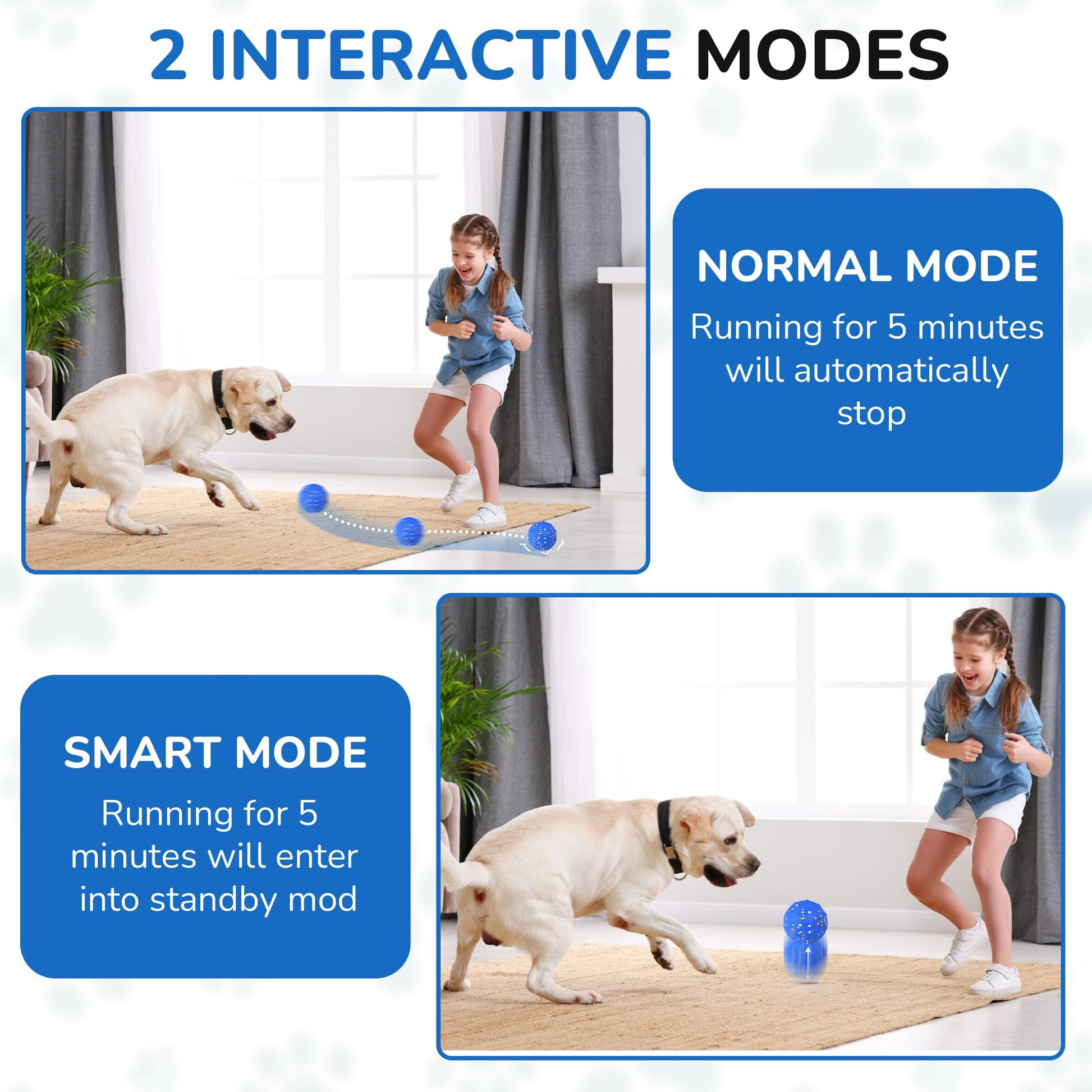 【Smart Bouncing, Dual mode】Press and hold for 3 seconds to switch modes in power-on state, Normal Mode: a 5-minute auto shut-off for energy saving, and a Smart Mode that wakes up with just a touch. Its random bouncing mimics real prey, making it the ultimate interactive dog ball and one of the best dog boredom toys for dogs who need stimulation.