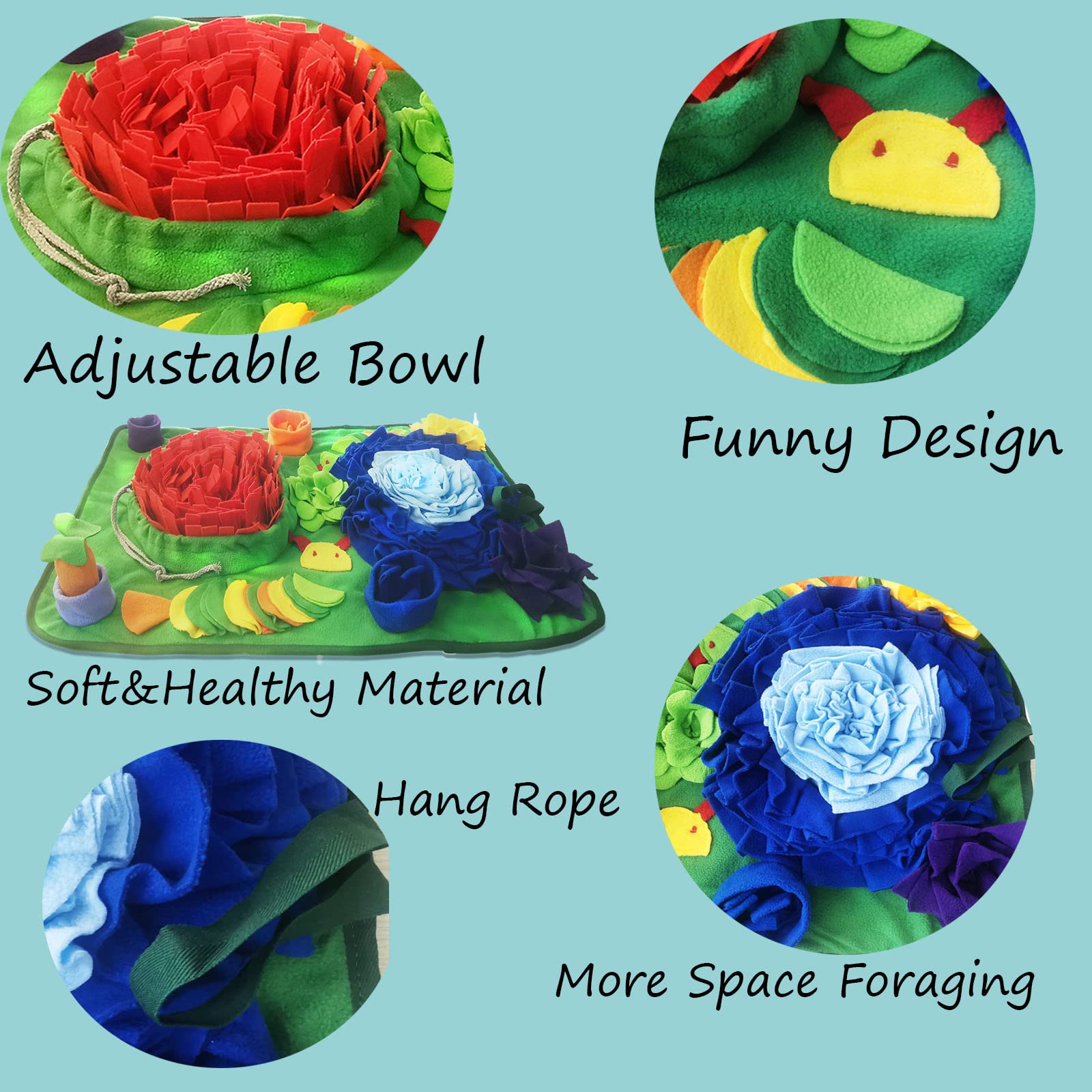Non-slip Portable Snuffle Mat Design:The bottom with Non-Slip cloth that effectively holds the mat and prevents the dog from moving the mat.Easy to store and carry. This pet snuffle feeding bowl, which can firmly fix this feeding bowl toy on the floor to prevent food from being scattered everywhere.