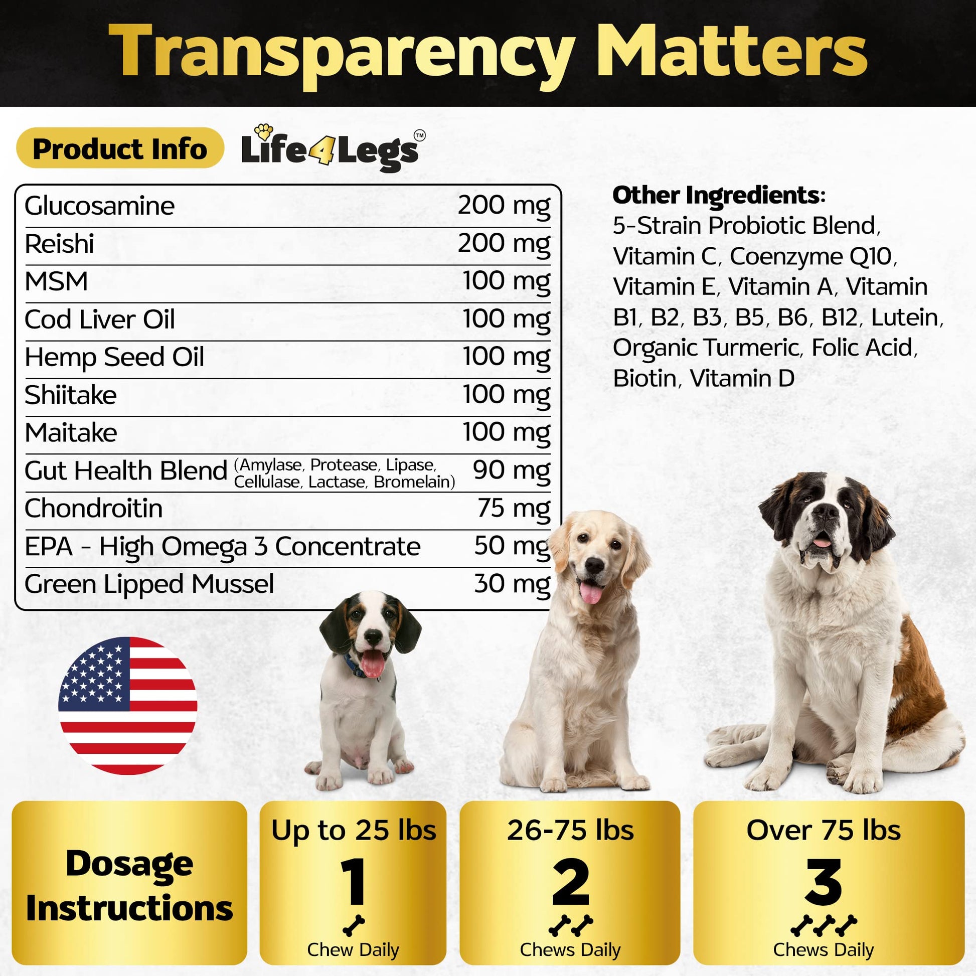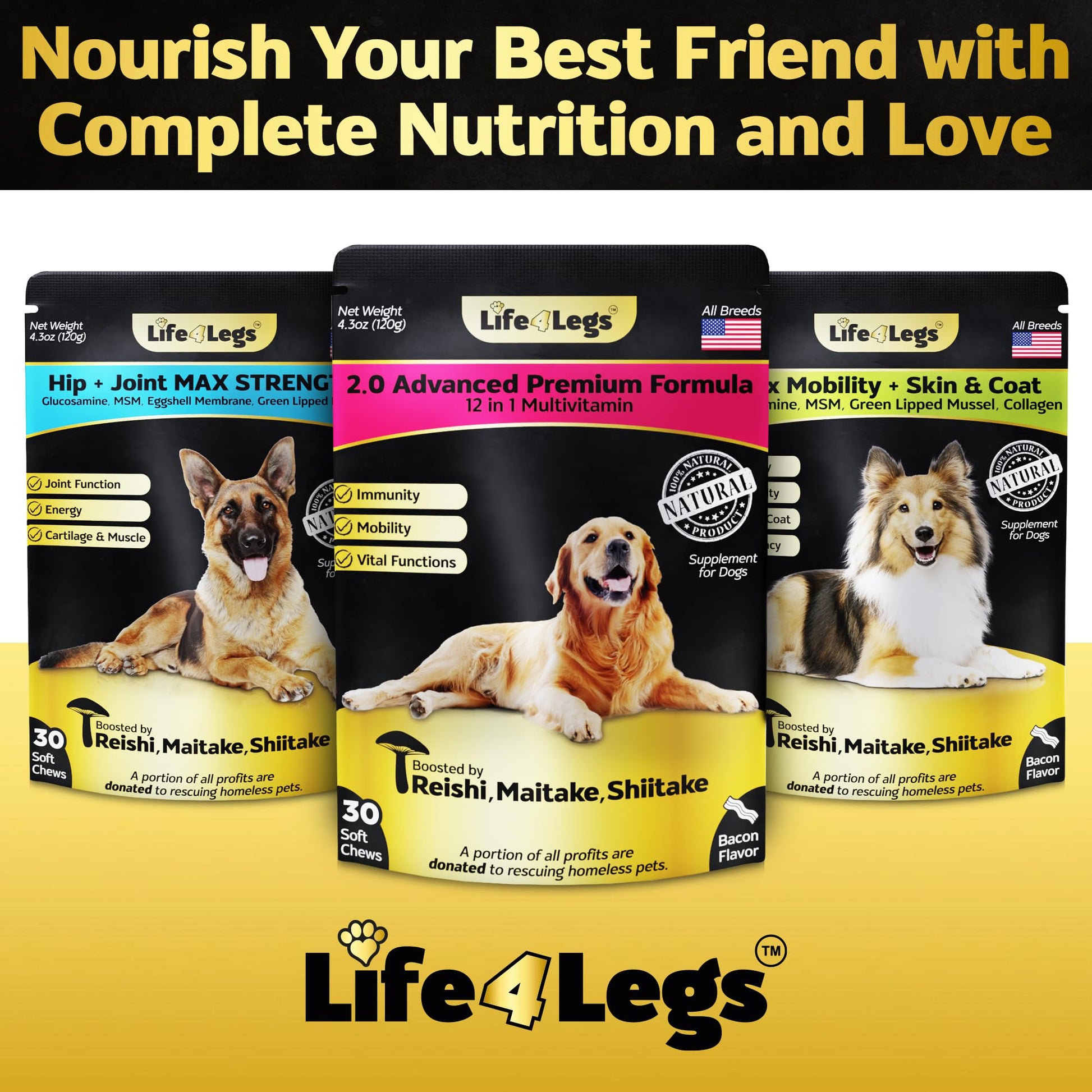 - ✅HIP AND JOINT SUPPORT: Life4Legs natural dog vitamins can help reduce joint inflammation and rigidity, allowing your best bud to enjoy enhanced mobility and flexibility by increasing lubrication.
