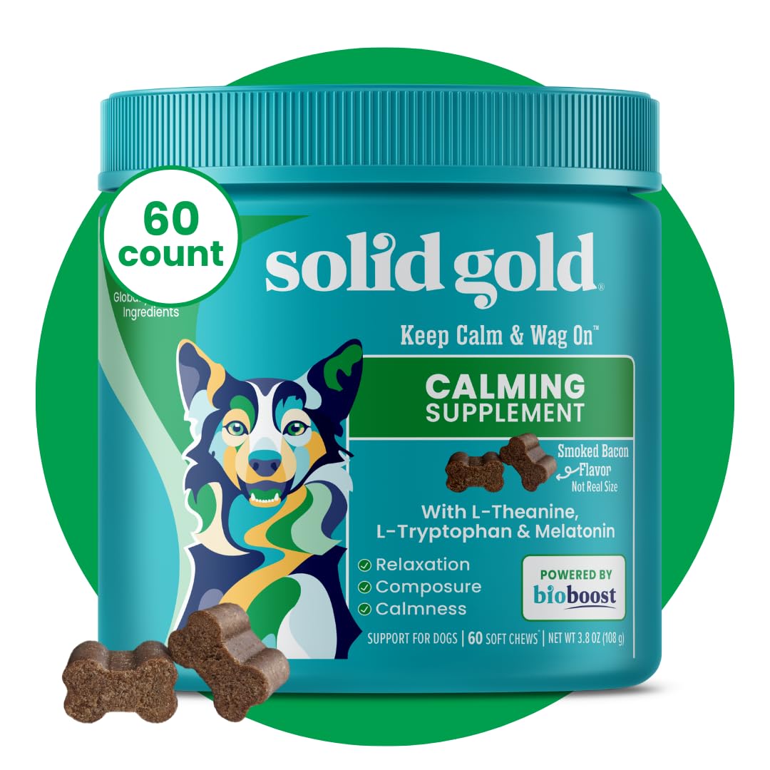 Solid Gold Calming Chews for Dogs - Dog Calming Chews W/Melatonin for Separation, Stress & Hyperactivity Relief - Supports Relaxation for Travel, Fireworks & Storms - All Ages & Sizes - Bacon - 60ct