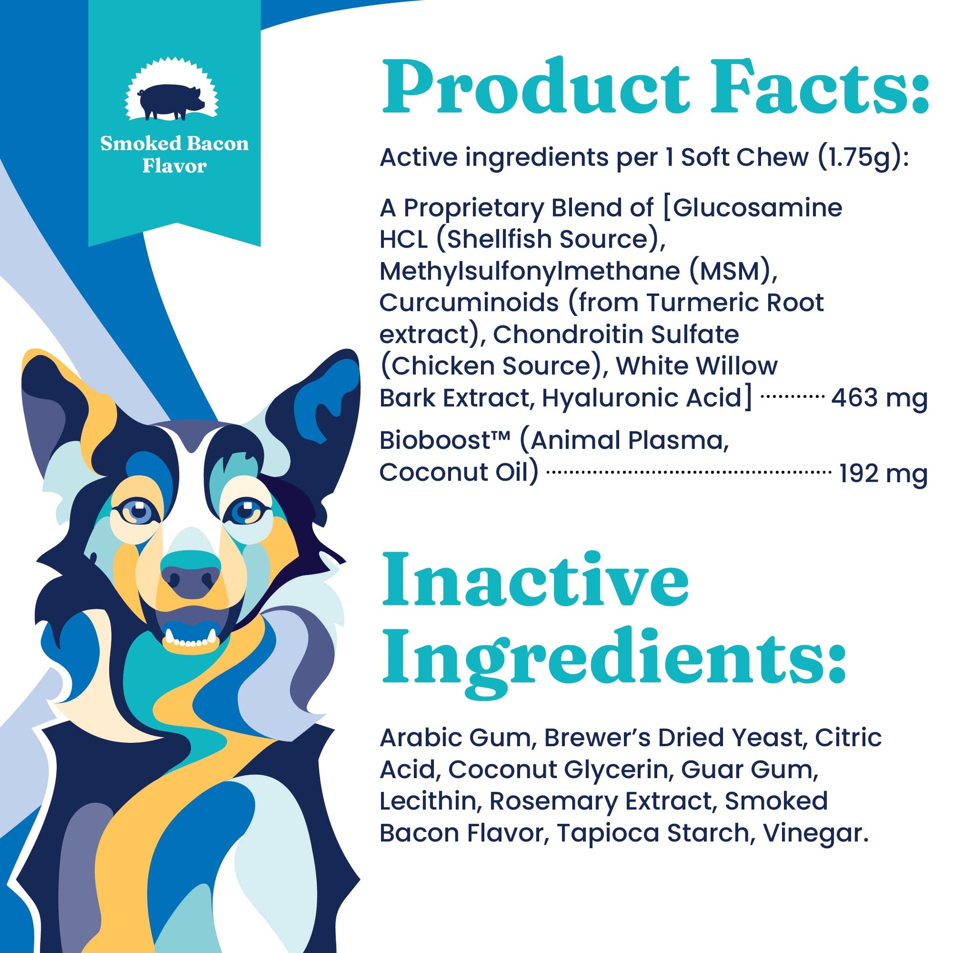 - Tasty Hip & Joint Support Supplement for Dogs - With a smoked bacon flavor dogs love, this is a joint support supplement dogs will race for. Great for picky eaters needing dog pain relief anti inflammatory support or arthritis pain reliever or dogs