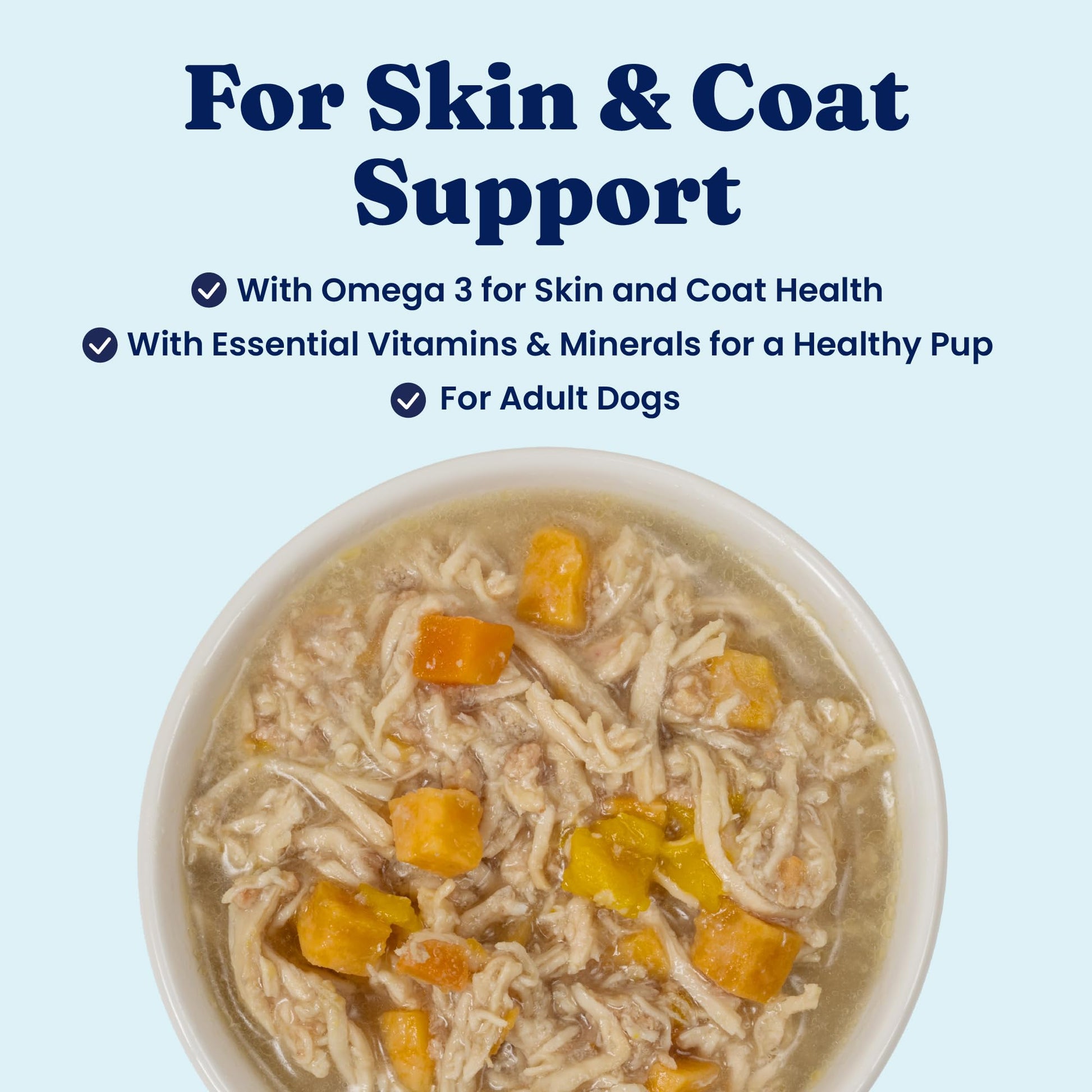 - Skin & Coat Support Wet Dog Food for All Breeds – These moist dog food cups are made with real chicken & salmon plus Omega-3 fatty acids to support healthy skin & shiny coats. Great for wet dog food small breed & wet dog food for large dogs needs