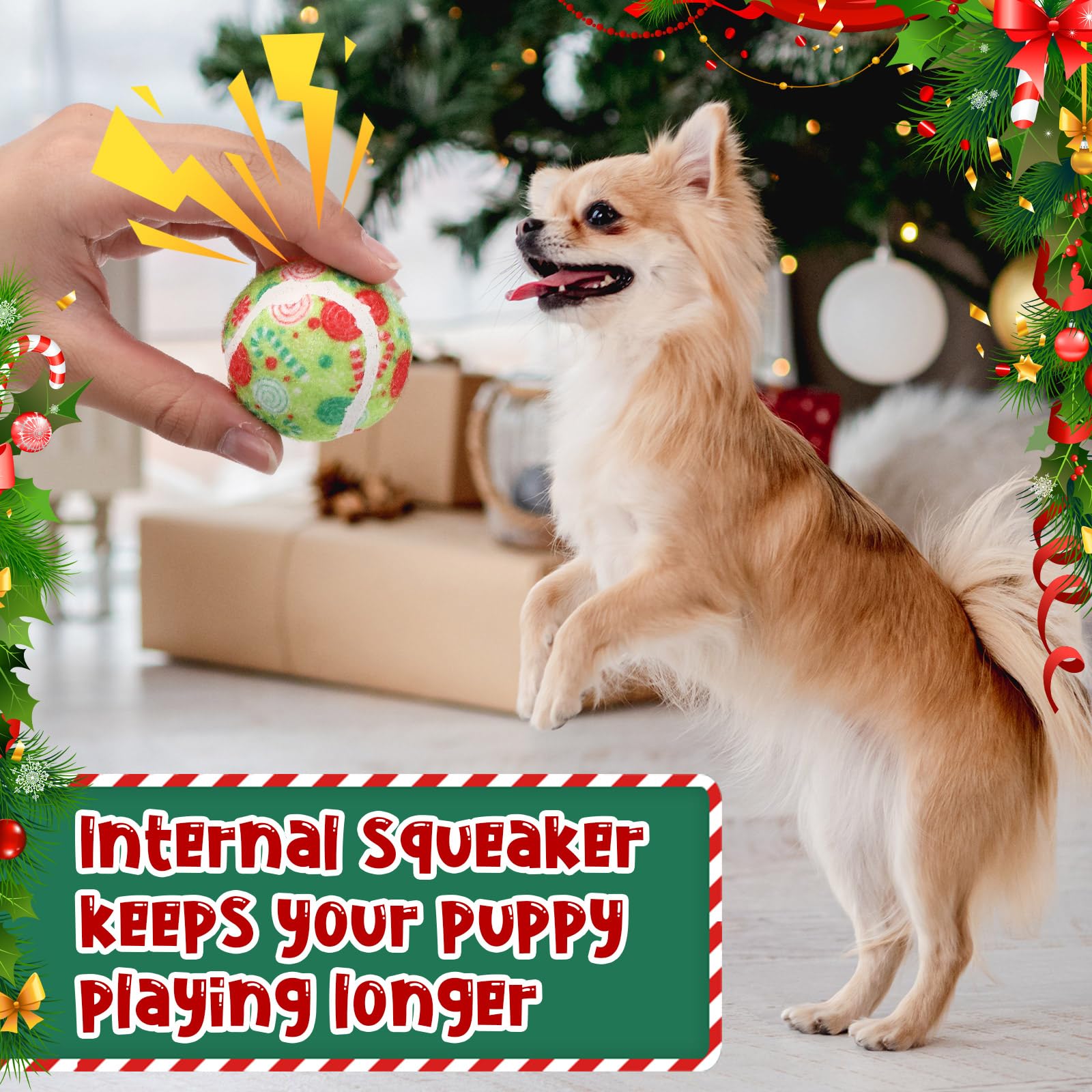 Each ball has a built-in squeaker that makes fun noises. Perfect for high-energy puppies, it encourages active play and keeps your dog entertained during the holidays.