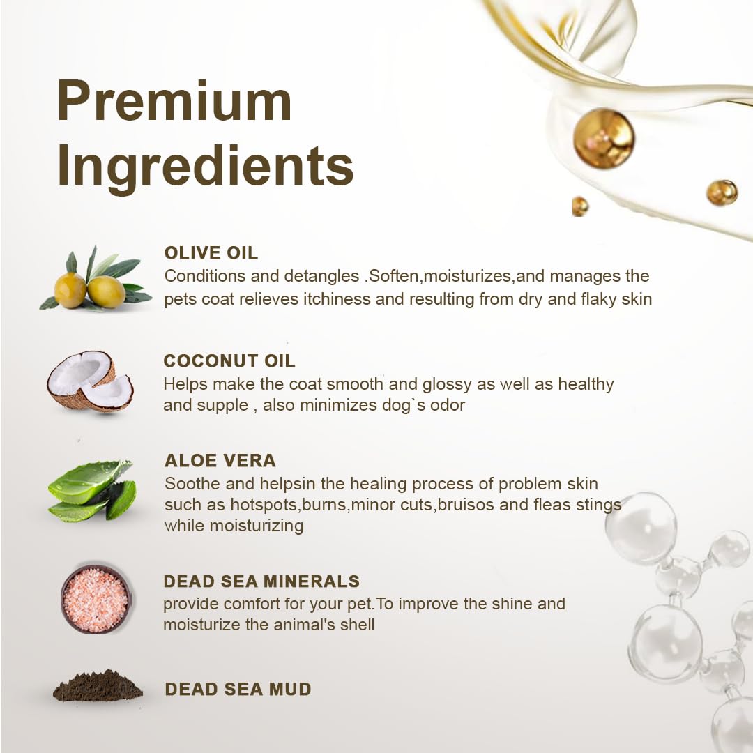 [Dead Sea Mud): Enriched with Dead Sea mud known for its natural cleansing properties, this dog shampoo effectively removes dirt and impurities from your pet's coat.