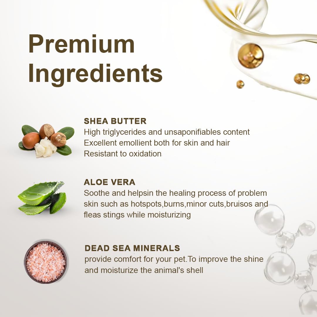[Dead Sea Minerals]: Infused with minerals sourced from the Dead Sea, it replenishes and nourishes your dog's skin, promoting a healthier and shinier coat.