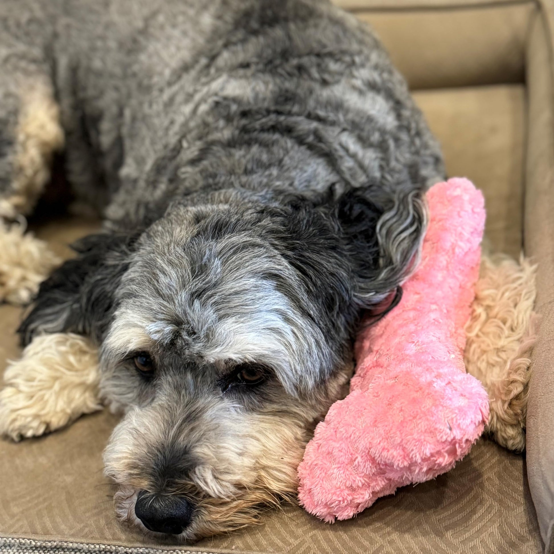 Details: Introducing the SPOT Soothers Warm Hugs Bone - the ultimate calming plush dog toy designed to provide puppy anxiety relief and reduce stress for medium to large dogs and puppies. Featuring lavender aromatherapy, our toy soothes your furry friend with the calming scent of lavender infused in artificial fragrance beads within a heart-shaped pouch. Unlike natural lavender, our scent ensures your pet's safety while promoting relaxation and tranquility. Combat anxiety and stress in your pets with our innovative Warm Hug Bone plush toy. Perfect for dogs experiencing separation anxiety, travel jitters, or fear of thunder and loud noises. The hidden squeaker can be removed for added convenience. Treat your dog to a sensory adventure with the Warm Hug Bone's microwaveable flax seed pouch, providing comforting warmth. Simply microwave the pouch for 1-2 minutes (depending on your microwave strength) and use it as puppy sleeping aid. Crafted with safety in mind, our removable warming pouch includes flaxseeds, rich in fiber and protein, promoting digestive health and boosting the immune system so it is safe if dogs swallow it. For ease of use, the squeaker and warming pouch are both located in a zippered compartment. Remember to remove the squeaker when using the warming pouch to prevent melting. **Breed Recommendation:** The SPOT Soothers Warm Hug Bone is ideal for small to medium breeds and puppies who do not engage in aggressive chewing behavior. We recommend this product for breeds such as Maltese, Pomeranian, Pug, Shih Tzu , Bichon Frise and similar breeds known for their gentle nature. Give your furry friend the comfort and relief they deserve with the SPOT Soothers Warm Hug Bone.