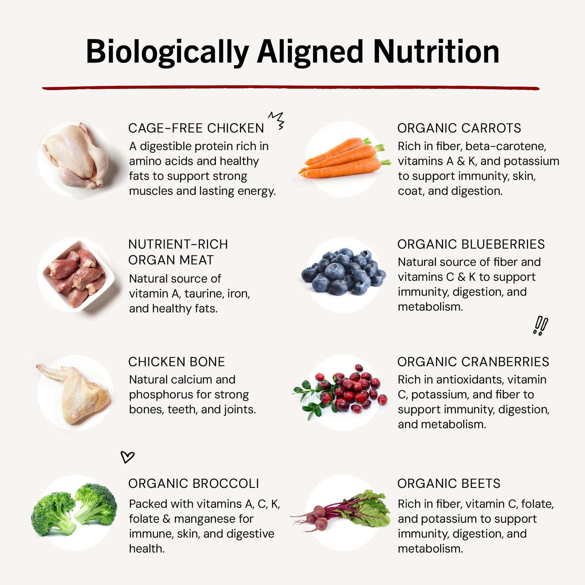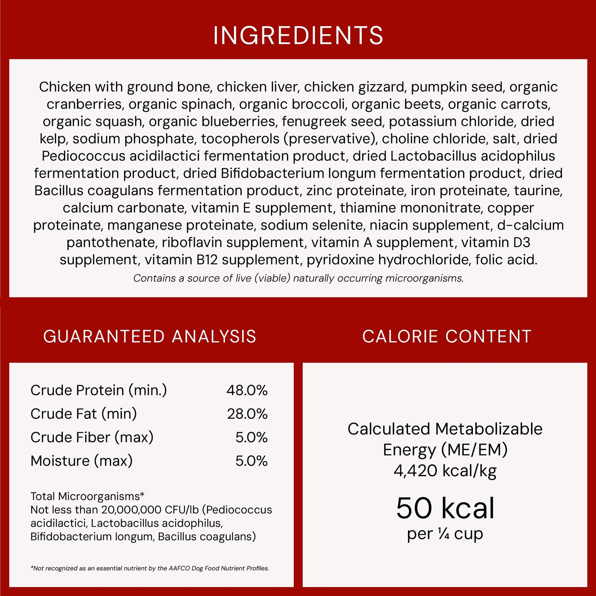 Premium Ingredients You Can See: 95% cage-free chicken, organs, and bone Organic fruits and vegetables Added probiotics for digestive health Essential vitamins and minerals NO artificial preservatives, colors, or flavors NO grains, gluten, potatoes, peas, lentils, fillers, or by-products