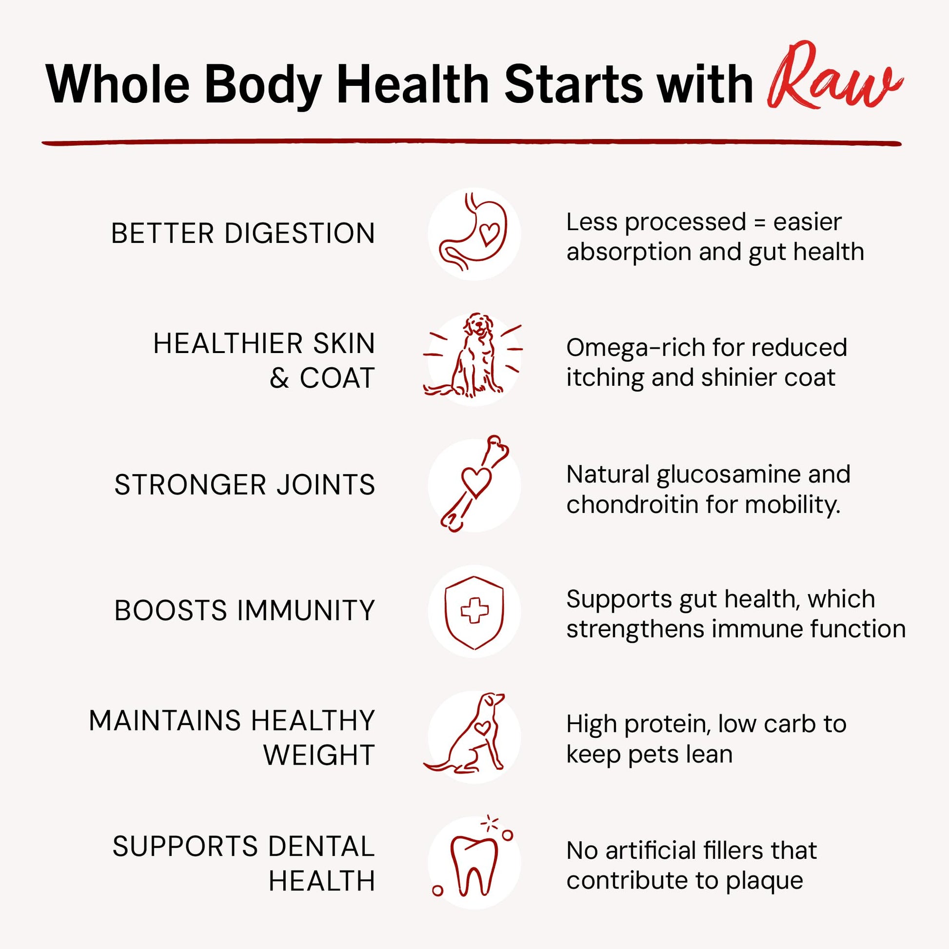 - Whole Prey Ingredients: Feeding your pet a diet similar to what their ancestors enjoyed in the wild helps your pet thrive; a raw diet helps support healthy digestion, strong teeth and gums, vibrant skin and coat, and stamina and vitality