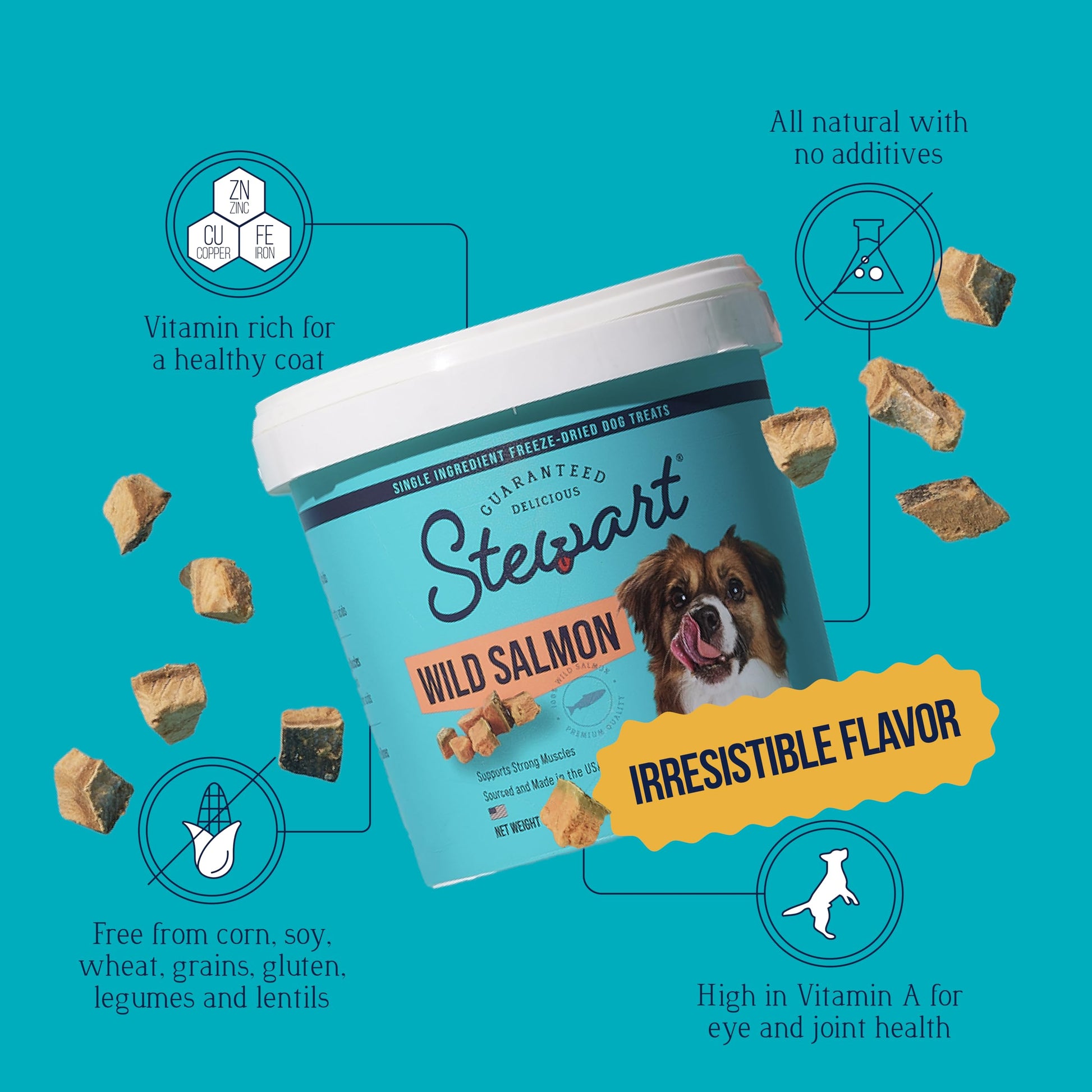 - Includes One 2.75 oz Resealable Tub: Stewart Freeze Dried Wild Salmon healthy dog treats are perfect for training, rewarding, or enhancing your dog’s meals with high-protein, single-ingredient nutrition with up to 55 treats per tub