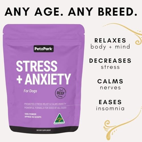 Stress and Anxiety Supplement for Dogs - Calming Dog Powder Supplement - Decreases Stress, Calms Fear & Anxiety, Eases Aggression & Insomnia, Relaxes Body and Mind - Beef Flavour - 6.4oz - 90 Scoops