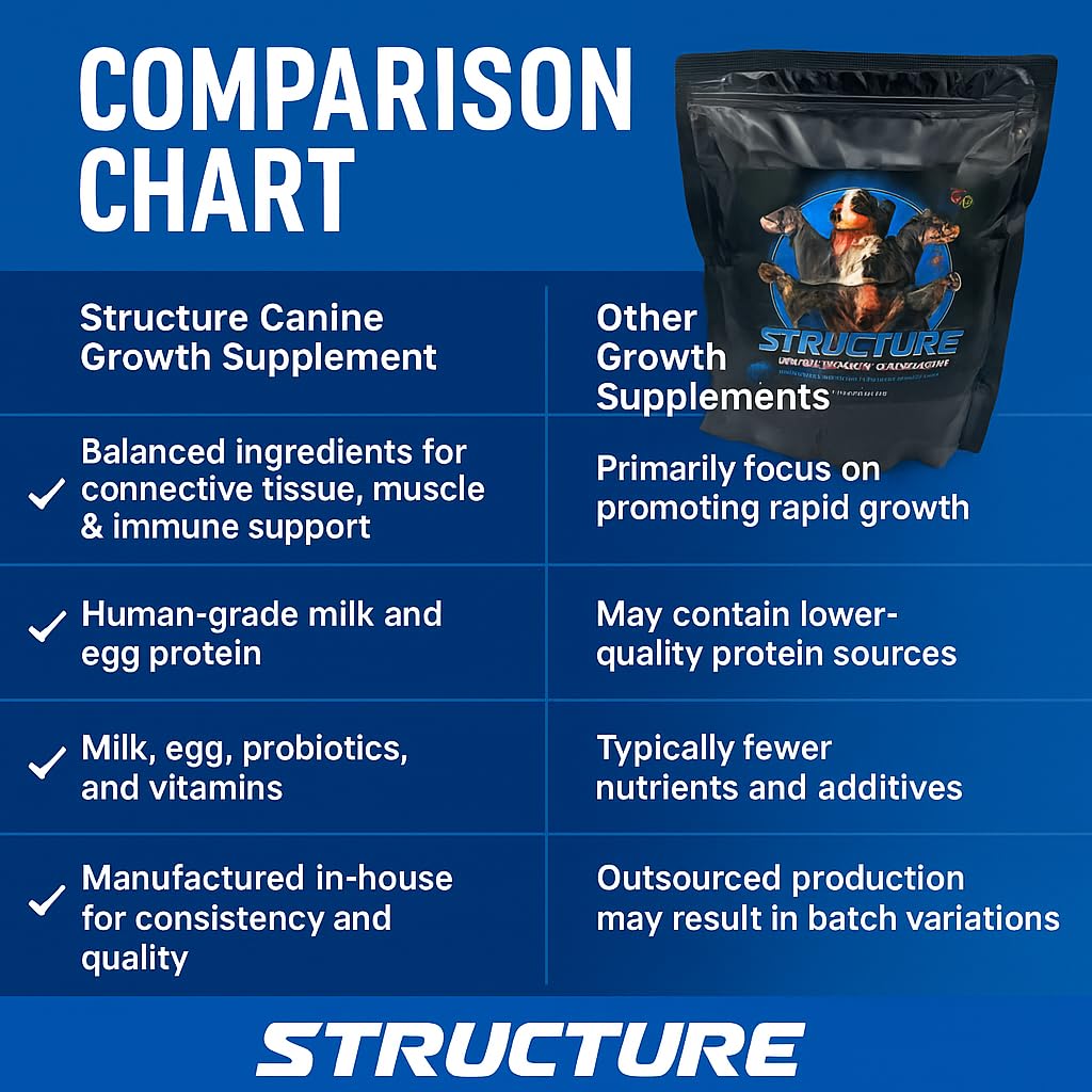 Why Choose Structure? While other formulas focus only on rapid growth, Structure focuses on balanced growth – ensuring that muscle and soft tissue development keep pace with bone growth. Developed through in-depth research and manufactured in-house for unmatched consistency, this formula delivers the nutrition your puppies need—every single time.