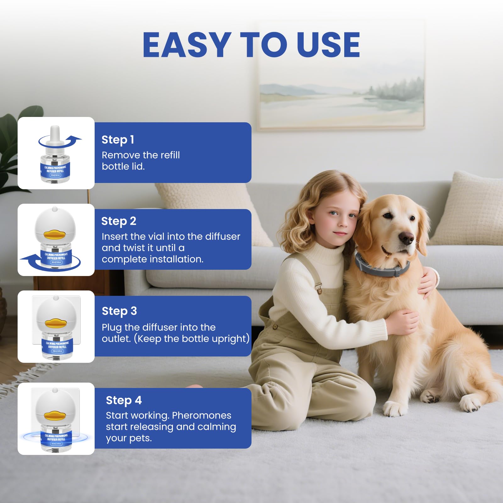 Soothe Dog's emotions - dog pheromones calming diffuser provides a non-seducation method to relieve dog anxiety, keep dogs alert and active, while promoting the feeling of the dog's calm diffuser. Imitate the natural facial dog pheromone sedation diffuser used by dogs to mark their territory