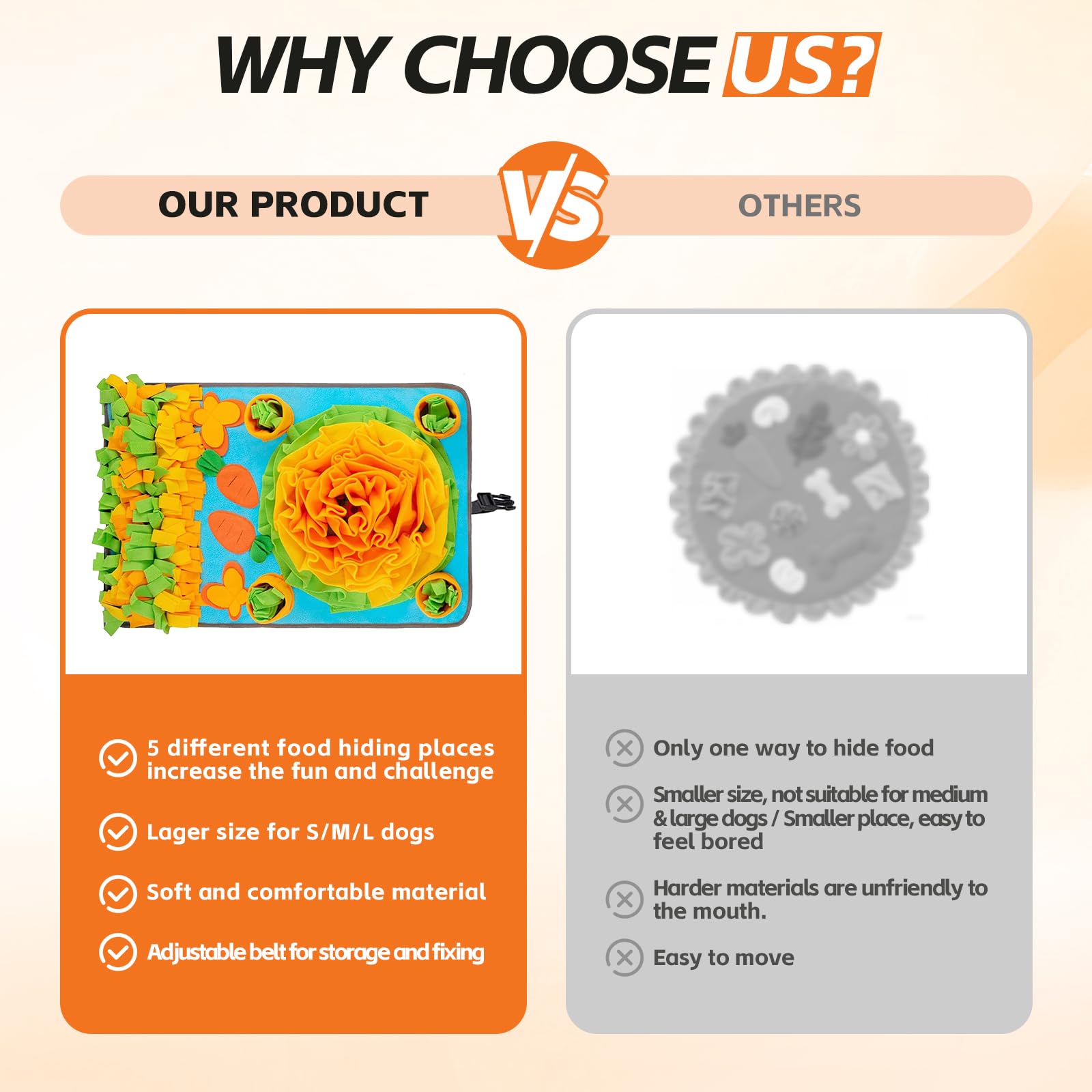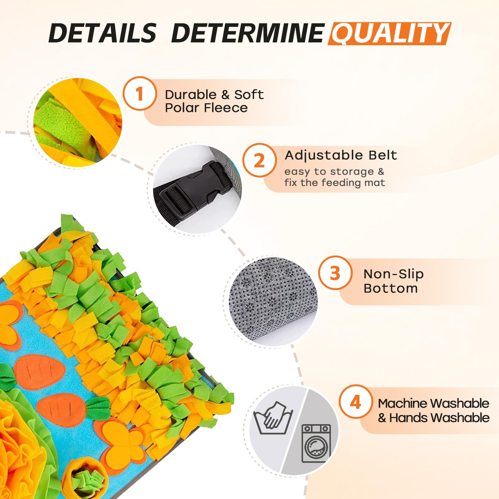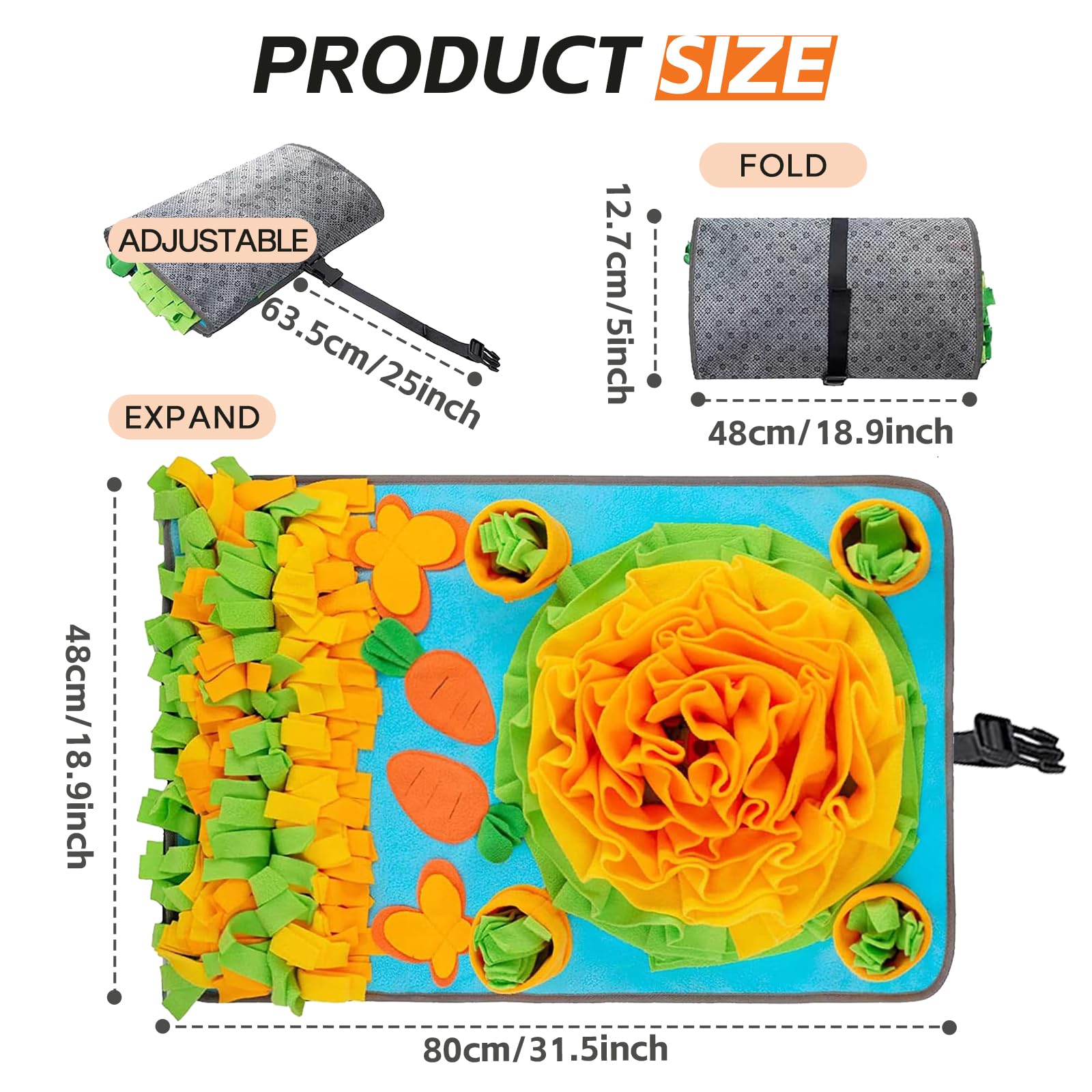 • [Larger Size] The size of this snuffle mat is 80cm x 48cm/31.5 x 18.9 inches. It's suitable for small, medium and large dogs. This dog snuffle mat is larger than other similar products on the market, providing dogs with more space to play and enjoy the game. Also it's very easy to storage with the adjustable belt which won't waste your living space.