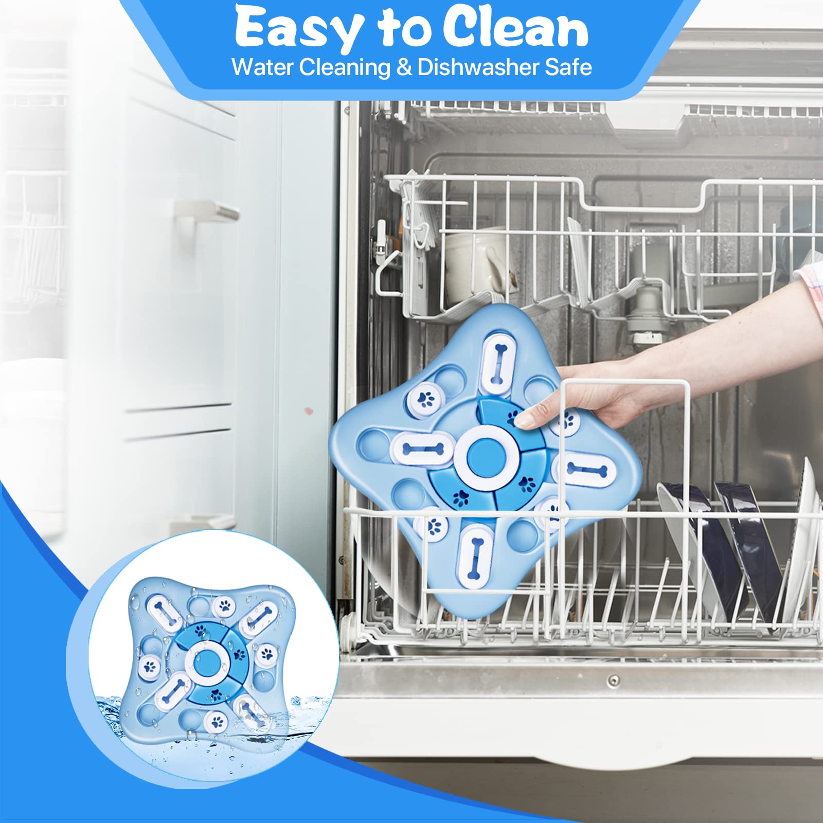 FOOD-SAFE MATERIAL, NON-REMOVABLE PARTS: Our mentally stimulating toys for dogs are designed with a non-slip base, have no removable parts. It is safer for play, which is made of non- toxic materials. Because of the design has built-in play parts that fold tightly and won't fall off. It is easy to clean with warm water and soap between uses, also dishwasher safe