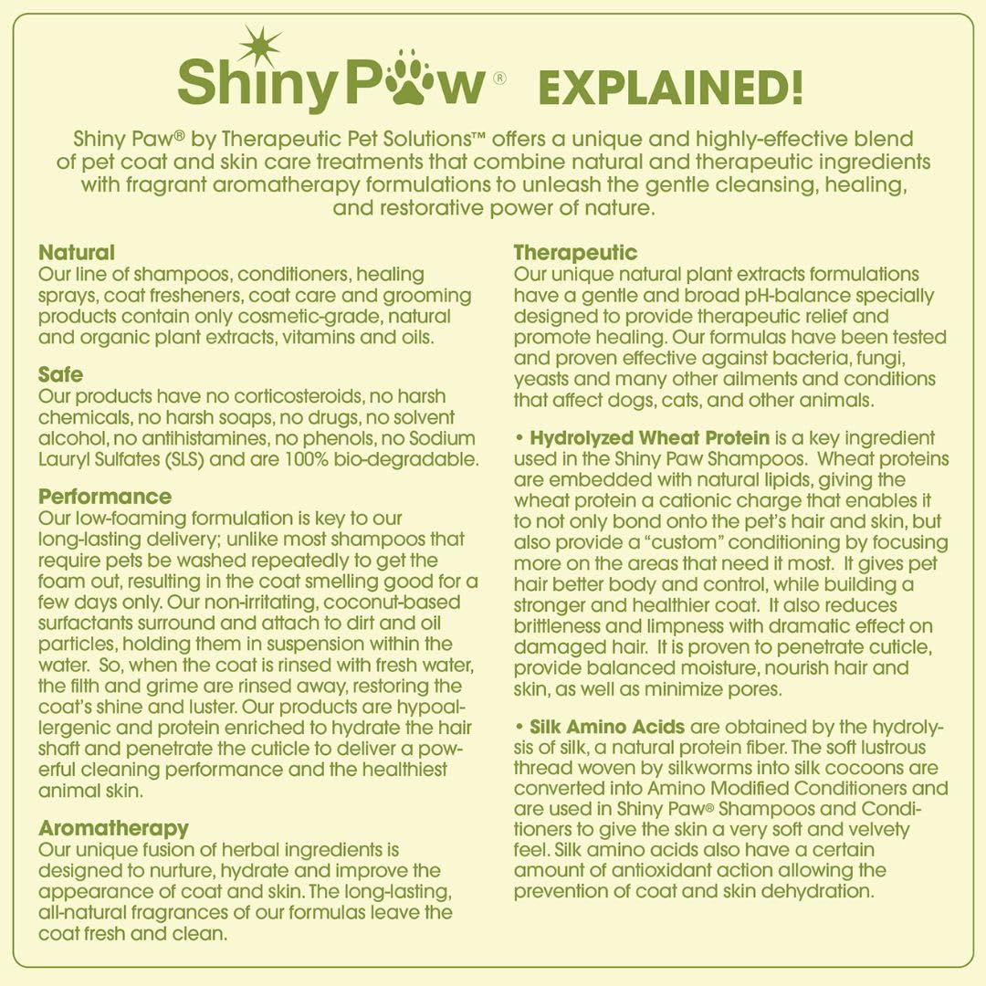 • UNIQUE NATURAL FORMULAS SINCE 2007 - Proudly 100% MADE IN THE USA. Shiny Paw's gentle puppy shampoo features a one-of-a-kind blend that gently enhances your pup’s natural coat, leaving it irresistibly soft, shiny, and smooth.