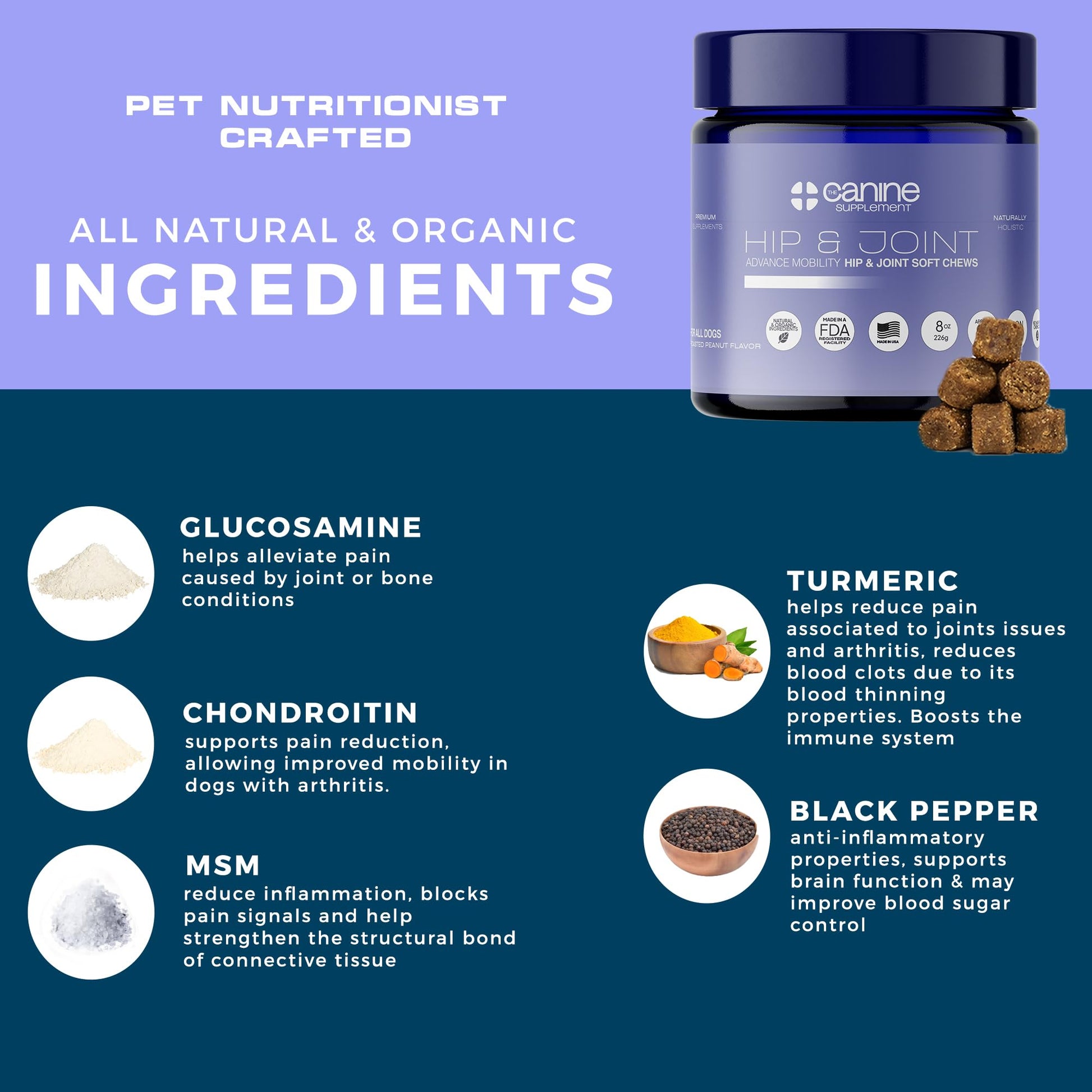 - 4-IN-1 JOINT SUPPORT FOR MOBILITY & RELIEF: This dog joint supplement combines glucosamine, chondroitin, MSM, and turmeric to help ease stiffness, reduce inflammation, and support joint cartilage growth. Ideal for daily hip and joint care, it helps improve comfort, flexibility, and long-term mobility for dogs with arthritis or joint discomfort.