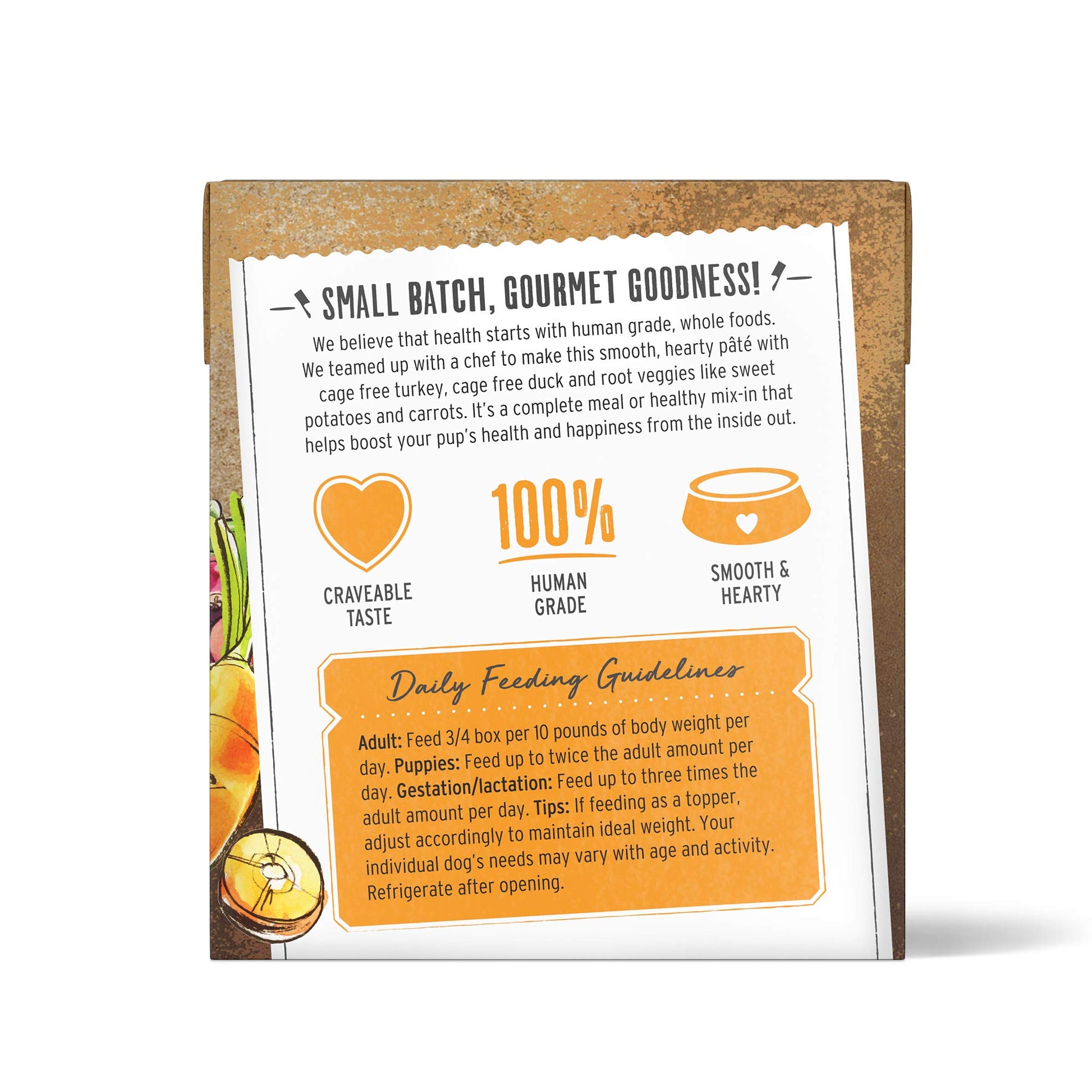 Details: Treat your pet to a chef-crafted meal with The Honest Kitchen's Butcher Block Pâté! This hearty, human grade recipe features kettle cooked cage free turkey, cage free duck and root veggies like sweet potatoes and carrots. Ideal for even the pickiest eaters, it’s suitable for dogs of all ages. Serve it as a complete meal or mix it in as a topper to boost flavor with real ingredients.